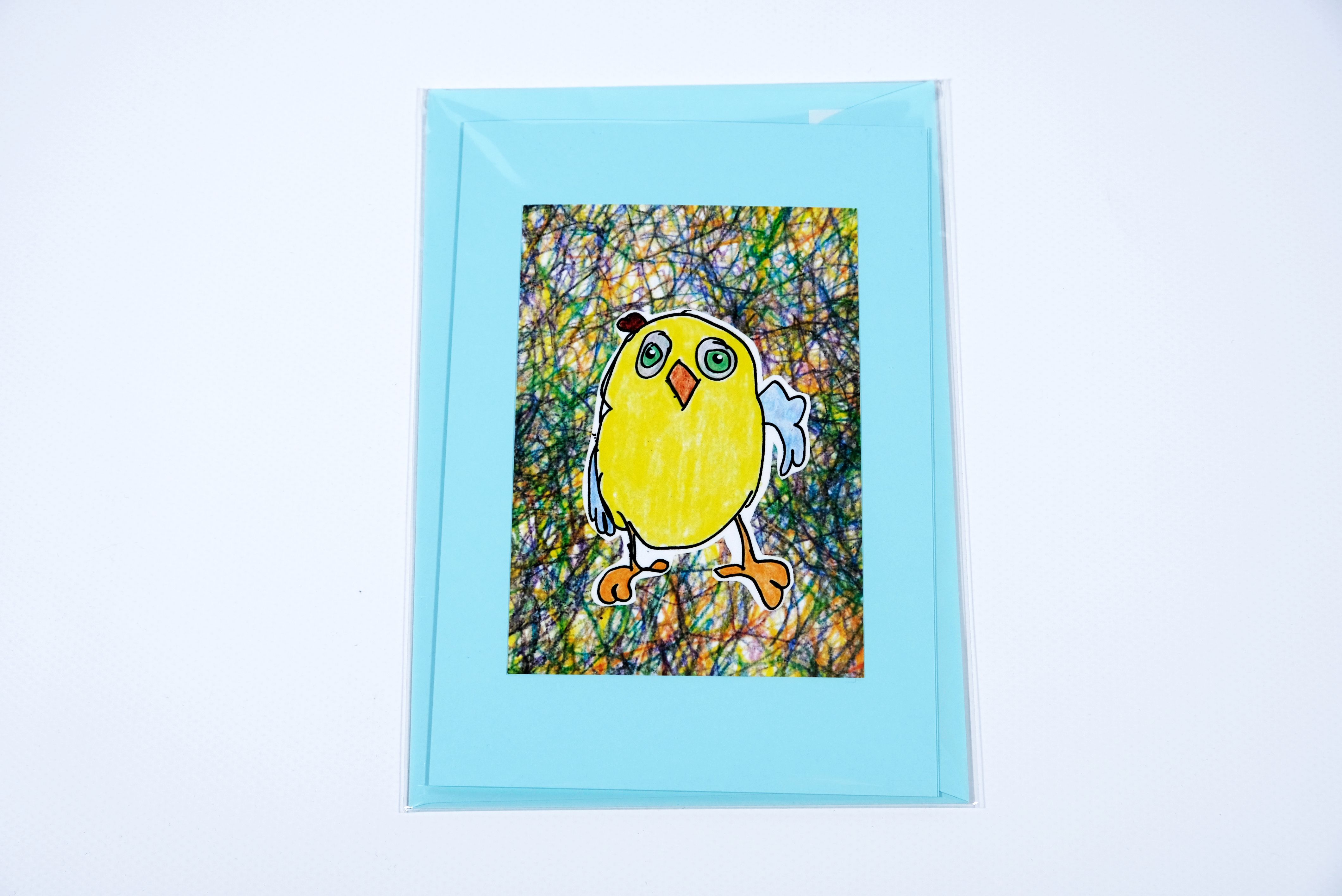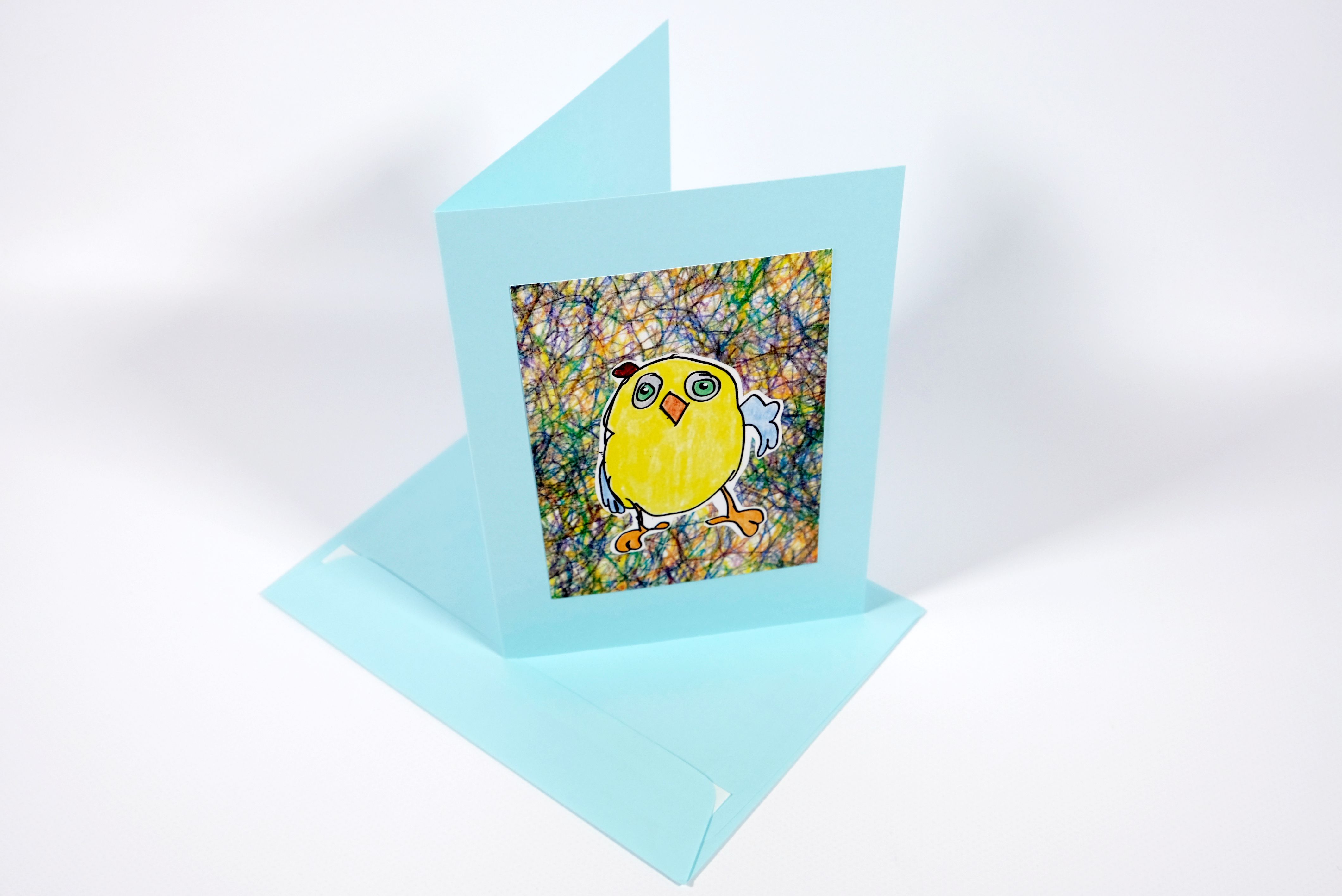 Diese A5 Karte zum aufklappen mit Couvert in Hellblau hat ein aufgeklebtes Motiv im Postkartenformat. Das Motiv ist ein gelbes Küken und der Hintergrund sind farbig gekringelte Striche in vielfältiger Form. Gezeichnet und angemalt wurde das Motiv durch Klienten und Klientinnen der Tagesstruktur Aktienmühle.