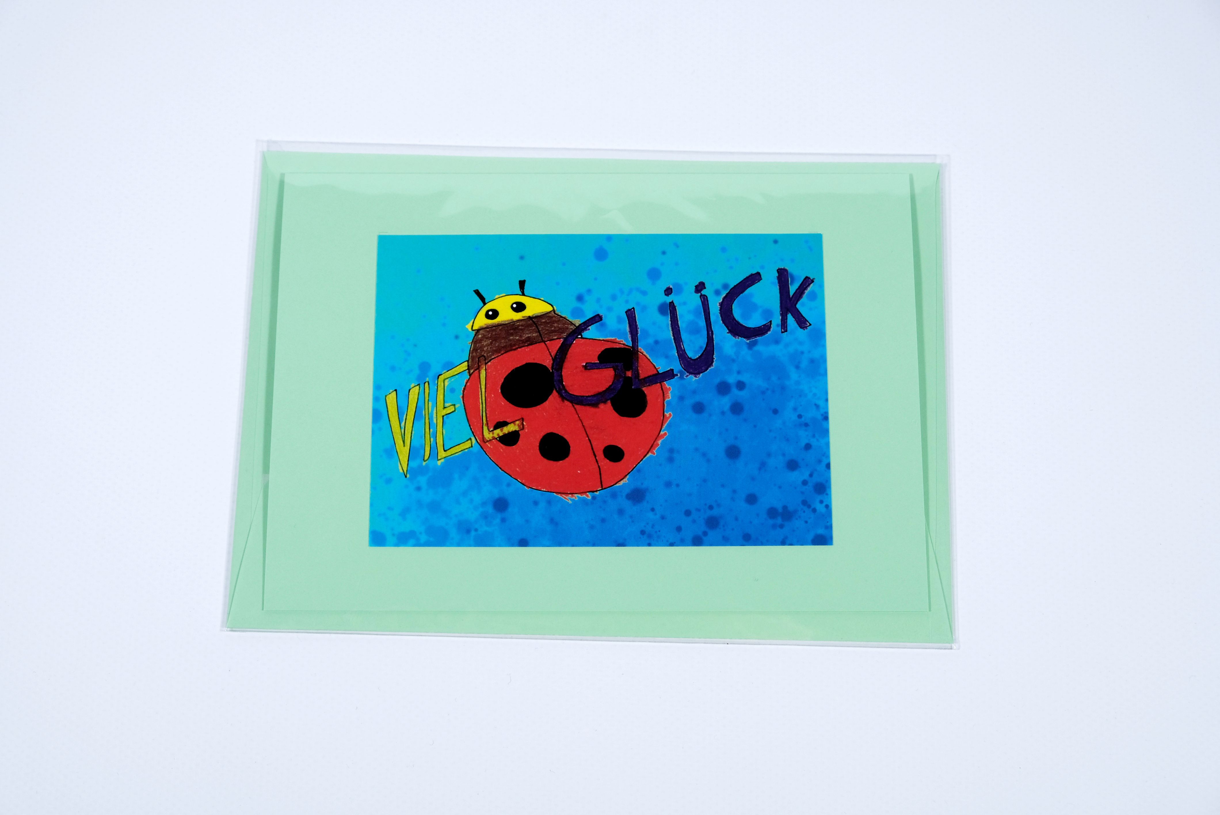 Diese A5 Karte zum aufklappen mit Couvert in Pastellgrün hat ein aufgeklebtes Motiv im Postkartenformat. Das Motiv ist ein gezeichneter Glückskäfer, über dem der Schriftzug "Viel Glück" steht. Der Hintergrund ist Blau-Hellblau im Verlauf mit dunkelblauen Tupfen. Gezeichnet und angemalt wurde das Motiv durch Klienten und Klientinnen der Tagesstruktur Aktienmühle.
