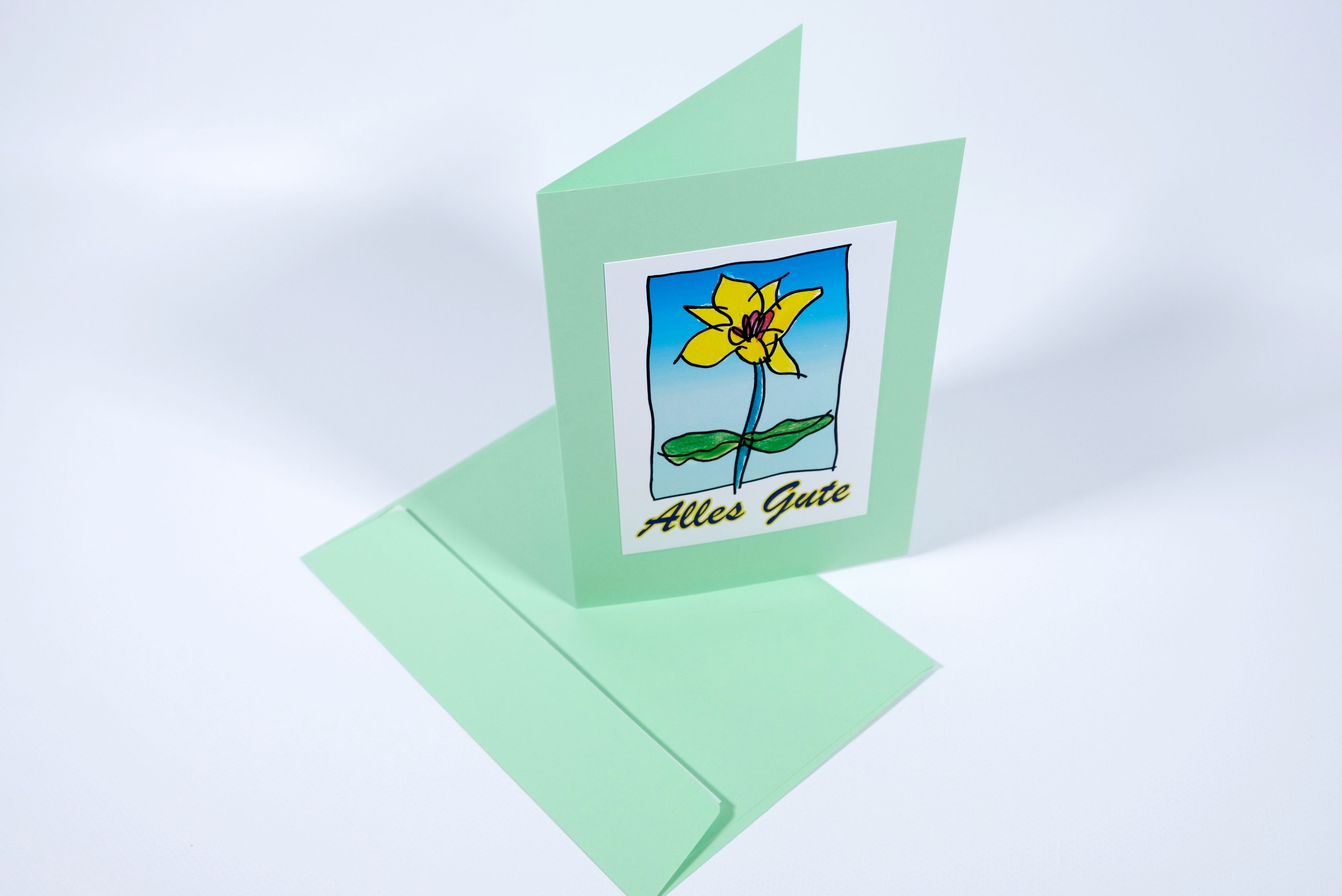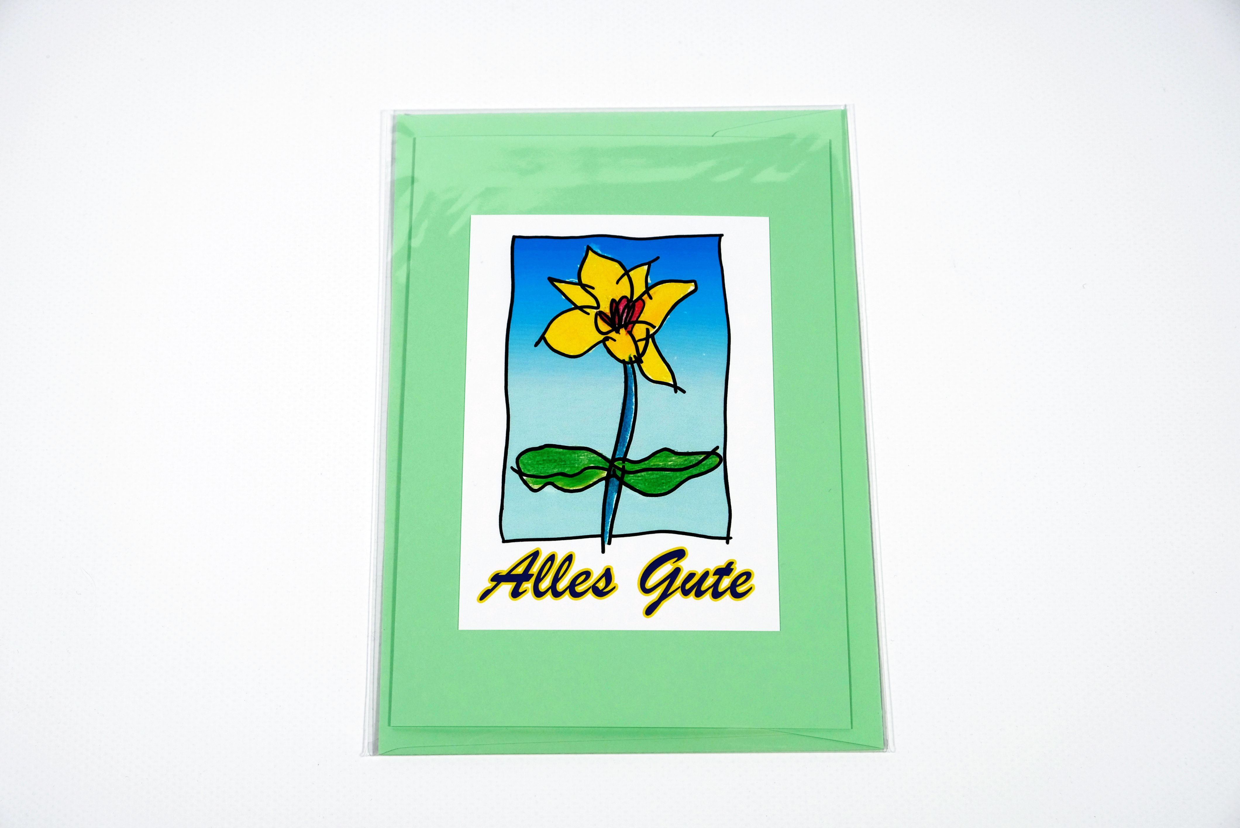 Diese A5 Karte zum aufklappen mit Couvert in Pastellgrün hat ein aufgeklebtes Motiv im Postkartenformat. Das Motiv ist eine Blume mit gelber Blüte, grünen Blättern und blauem Stängel. Darunter ist der Schriftzug "Alles Gute" in schwarz/gelb-umrahmter Schrift. Der Hintergrund ist ein blau-hellblauer Verlauf in einem Rahmen, darumherum hat es einen weissen Hintergrund. Gezeichnet und angemalt wurde das Motiv durch Klienten und Klientinnen der Tagesstruktur Aktienmühle.