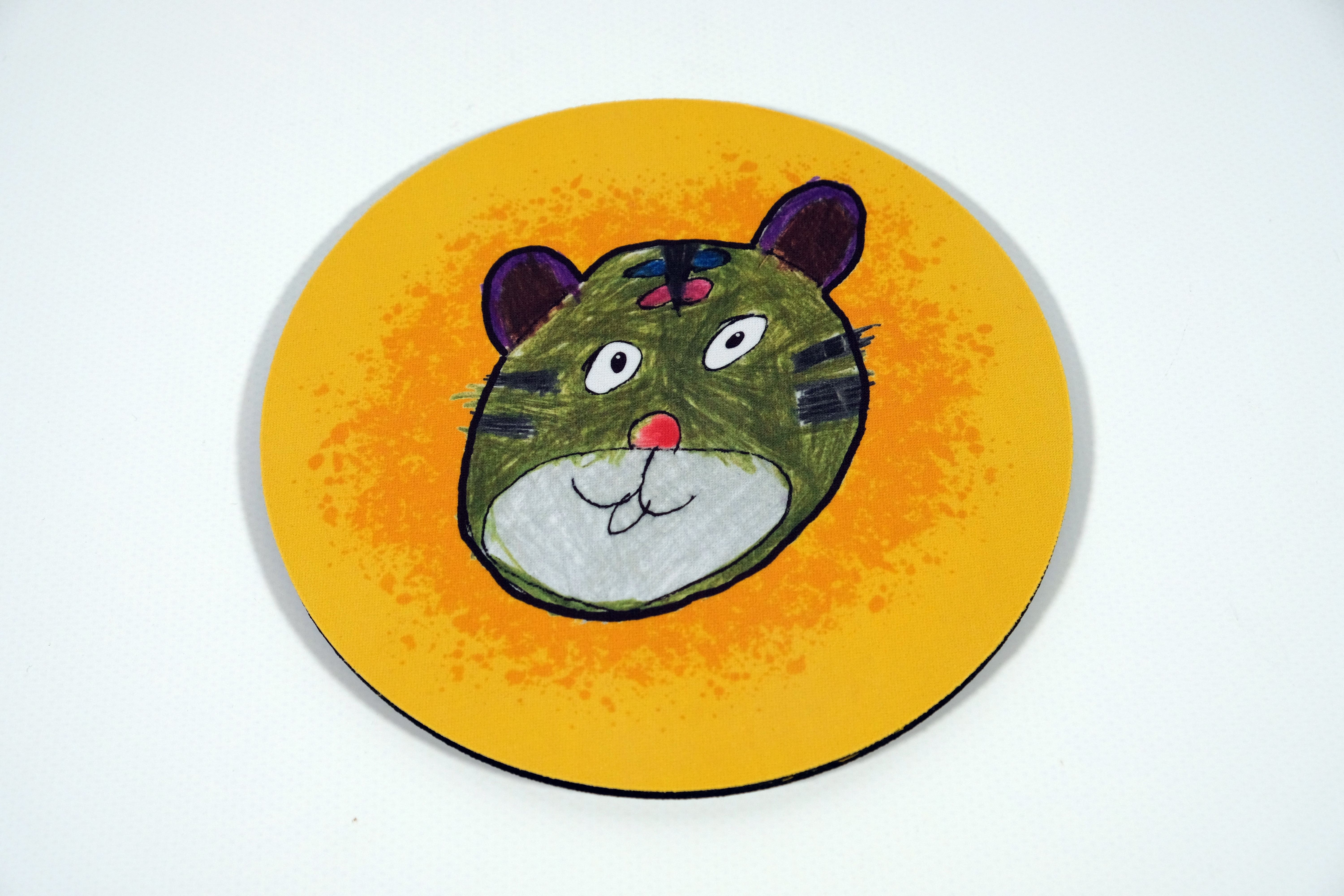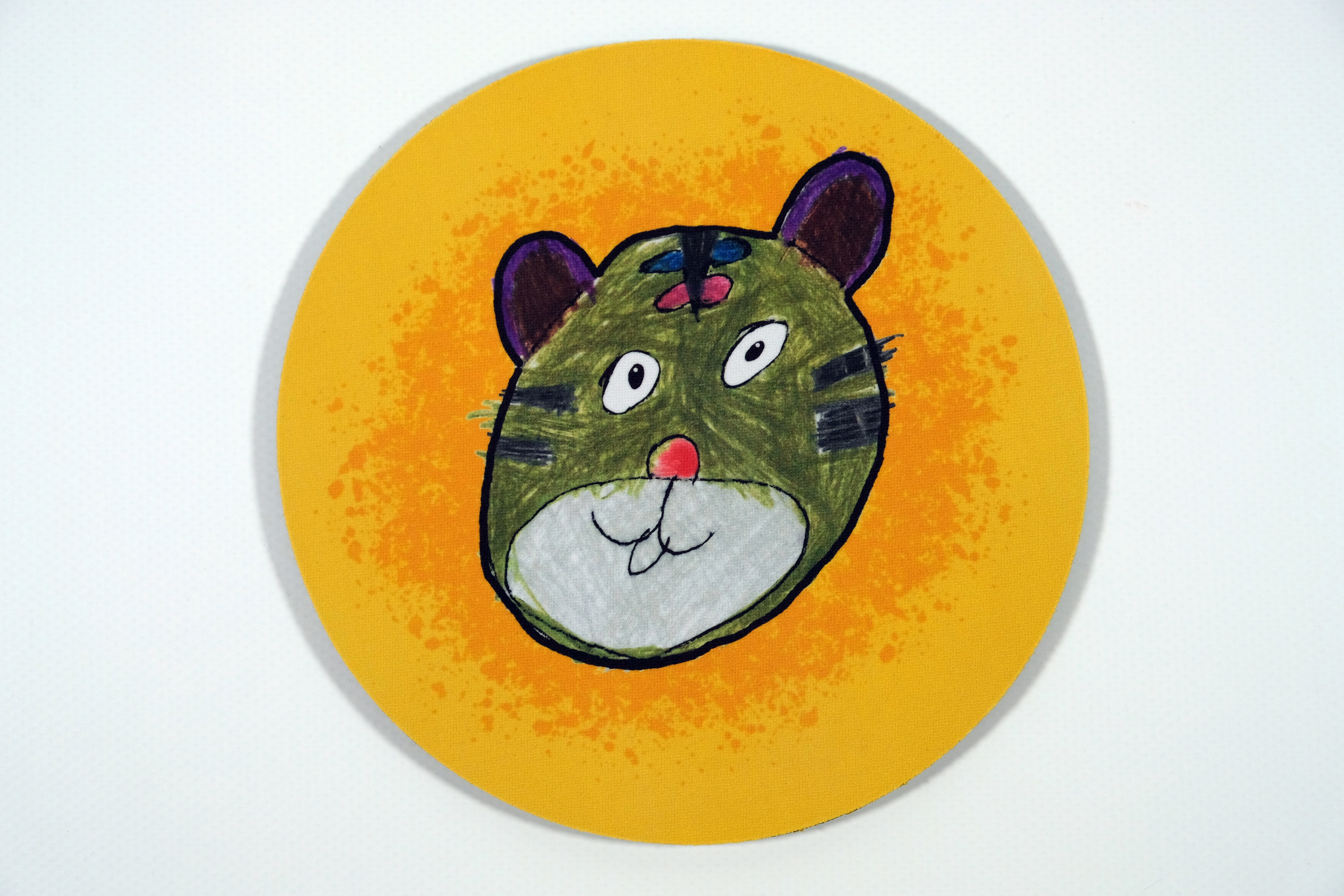 Das Motiv auf diesem runden Mousepad wurde durch unsere Klienten/innen gezeichnet. Es ist grüner Tigerkopf mit violetten Ohren, rosaroter Nase und grauer Schnauze. Er wurde mittig positioniert und um den Kopf herum sind dunkelbeige Tupfer die in einen sandfarbigen Hintergrund übergehen.