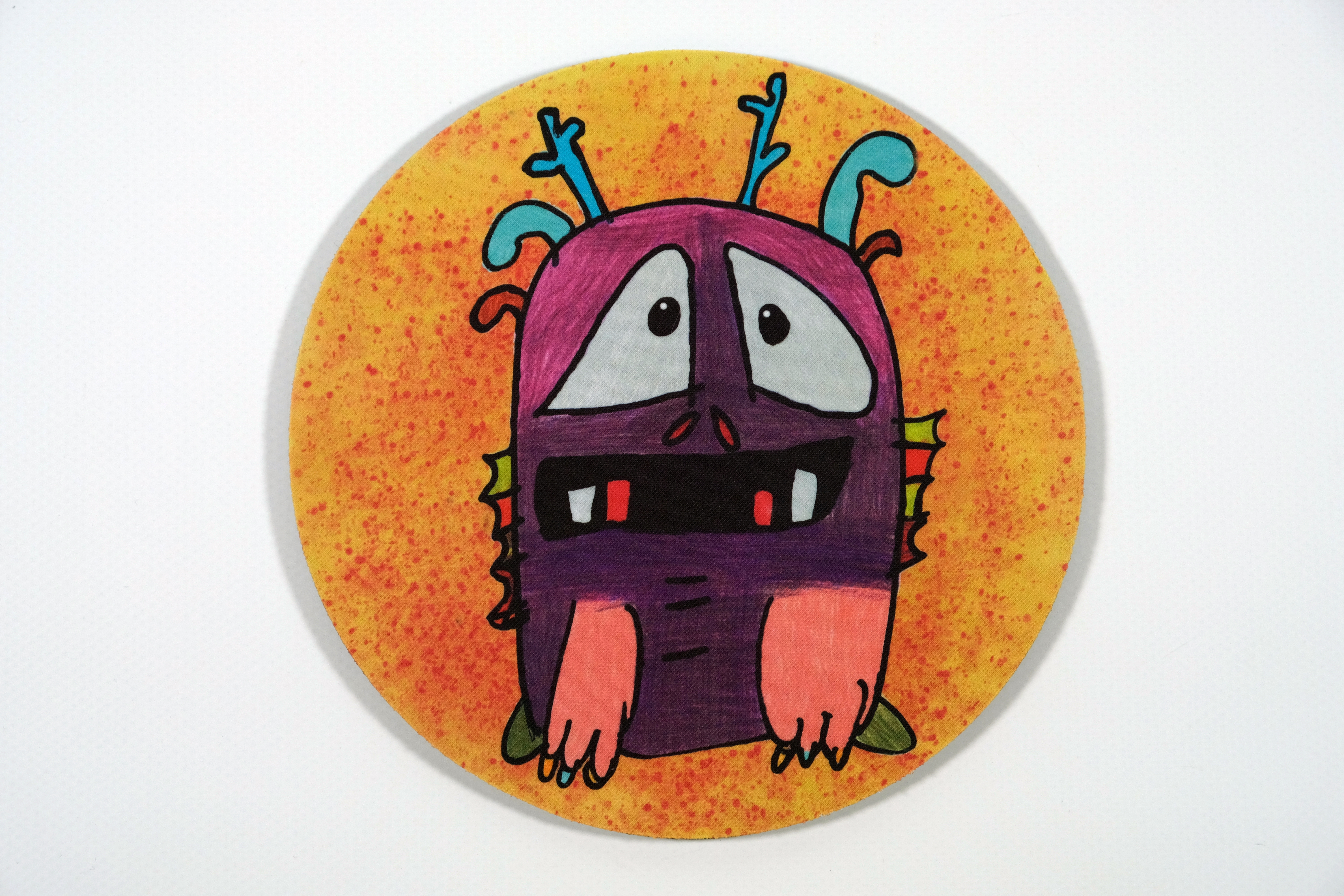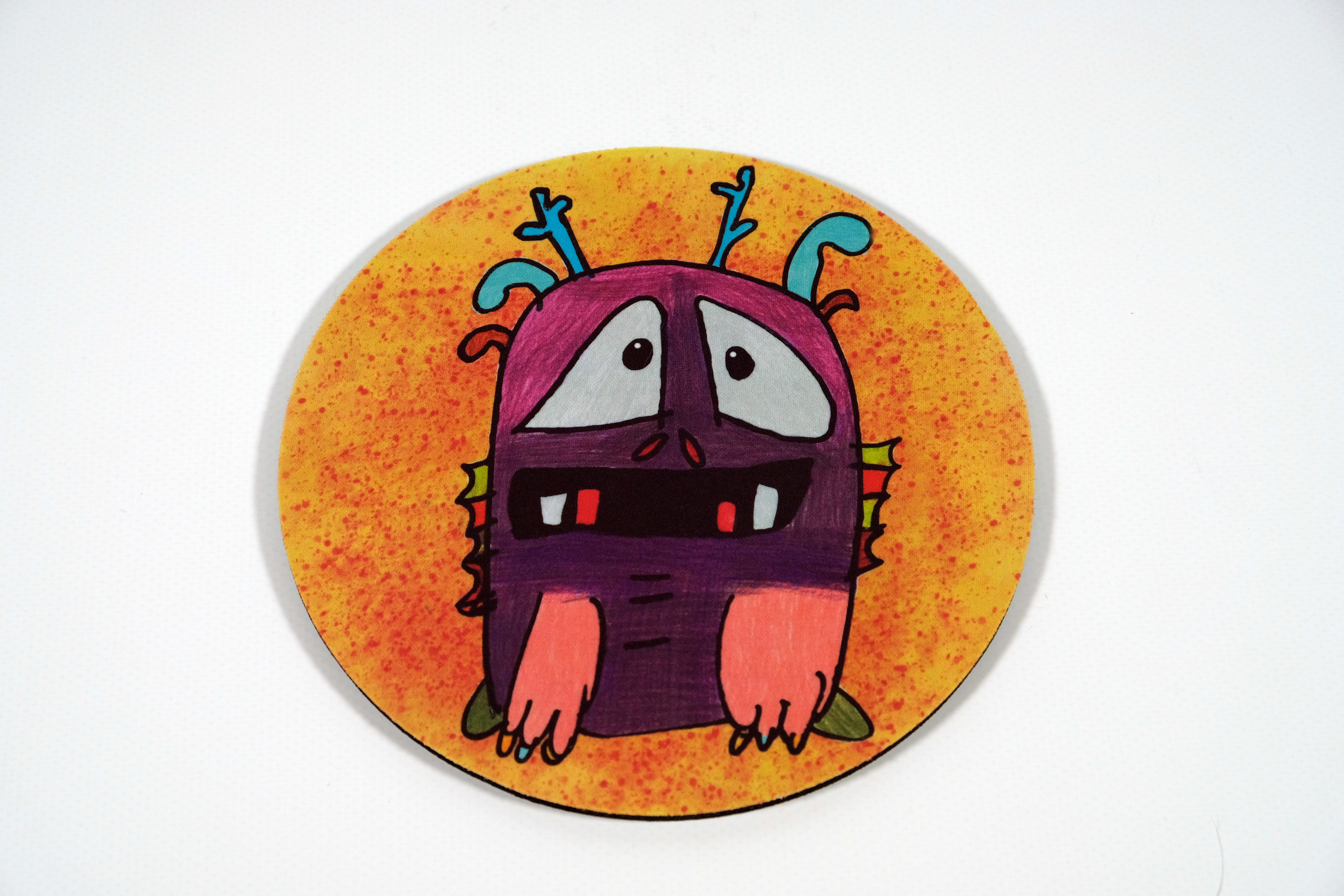 Das Motiv auf diesem runden Mousepad wurde durch unsere Klienten/innen gezeichnet. Es ist ein violettes Monster mit blauen Ohren und blauen Hörnern. Es hat rote und weisse Zähne und die Arme sind rosaort. Die kleinen drachenartigen Flügel sind rot und grün und der Hintergrund ist beige mit ganz vielen roten Tupfen.