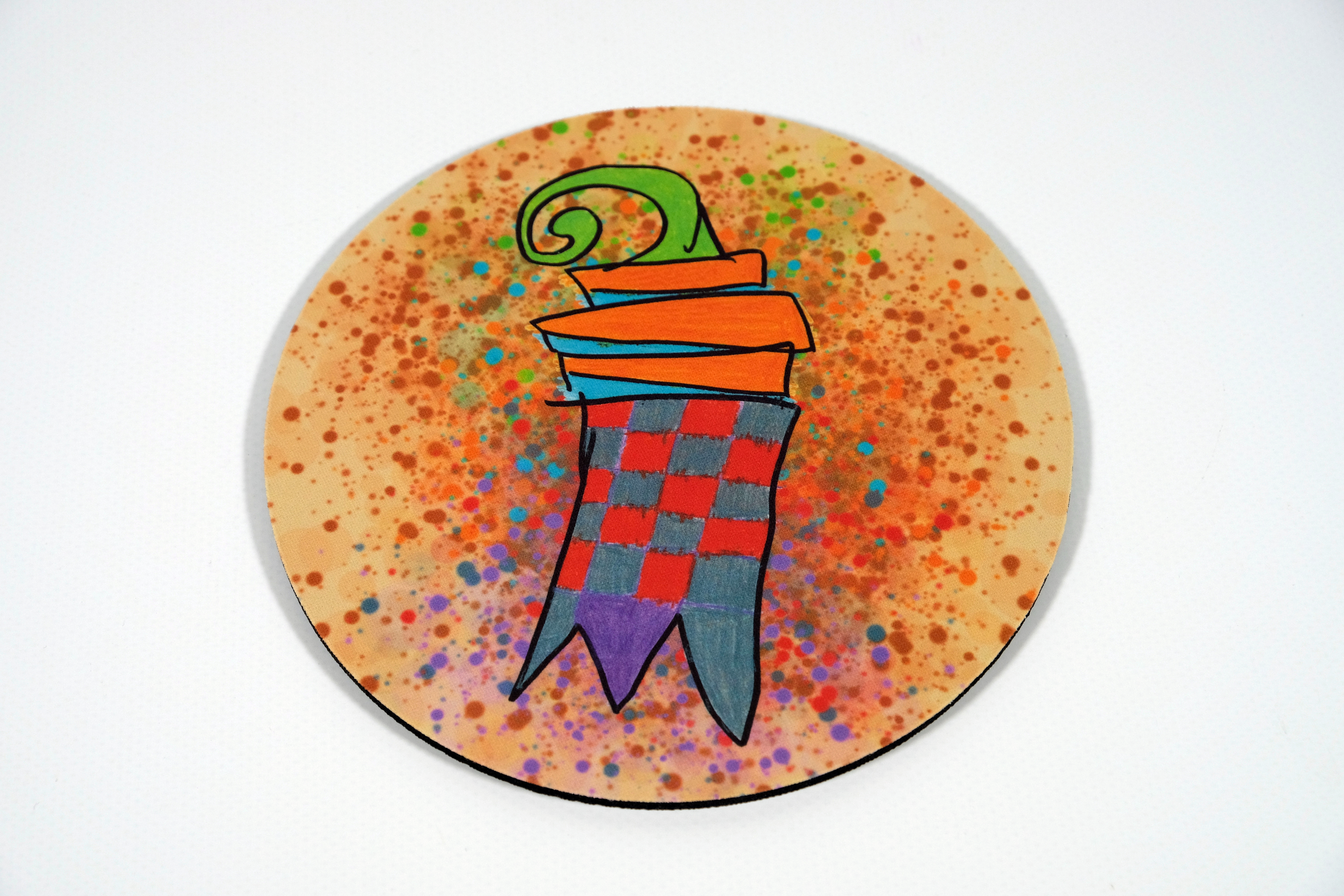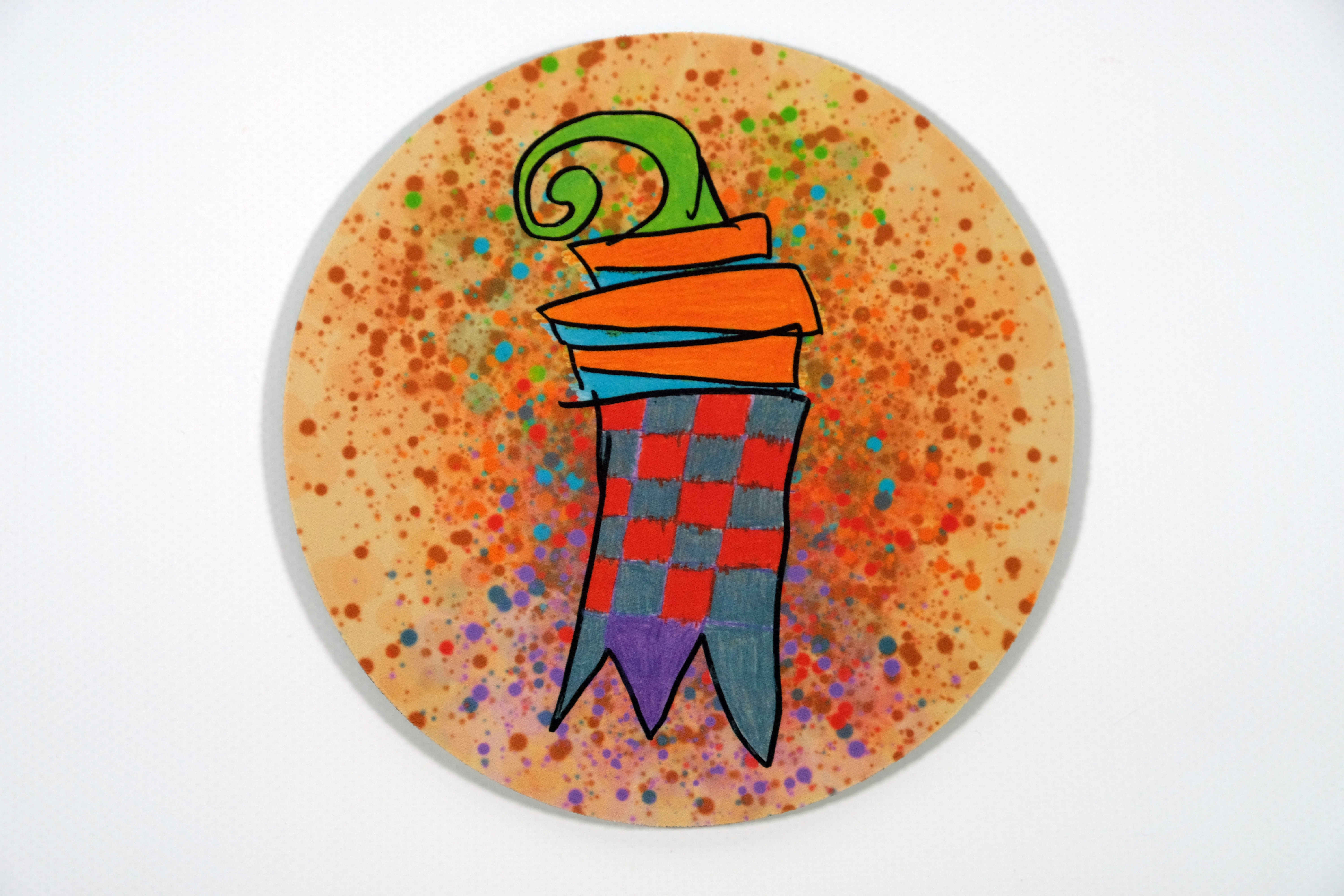 Das Motiv auf diesem runden Mousepad wurde durch unsere Klienten/innen gezeichnet. Es ist ein Basler Stab auf einem bunt getupften Hintergrund. Der obere teil ist grün, die Balken in der Mitte sind orange/blau und der untere Teil ist in einem rot/grauen Schachbrettmuster bemalt worden. Der mittlere Zacken unten ist violett.