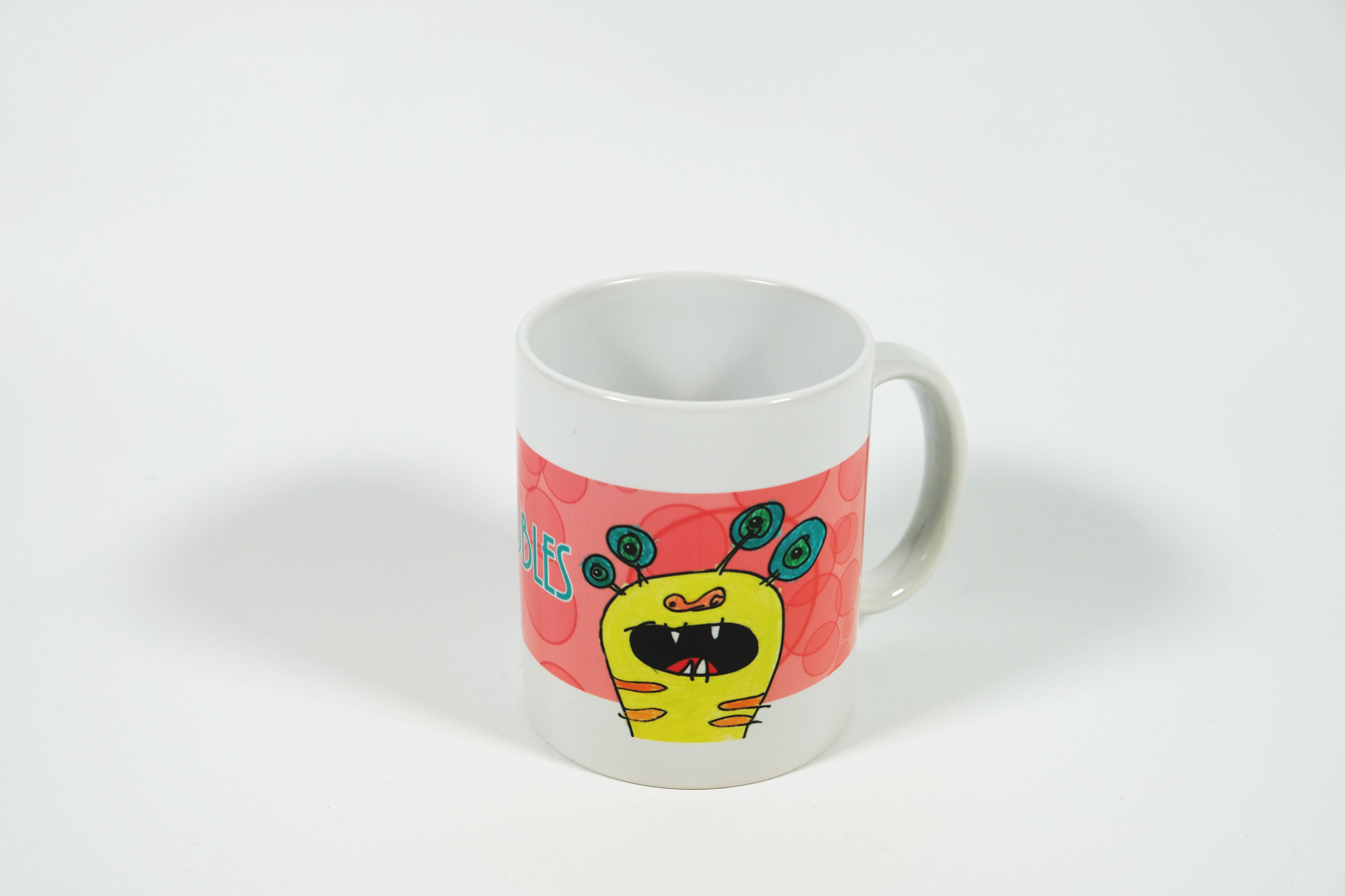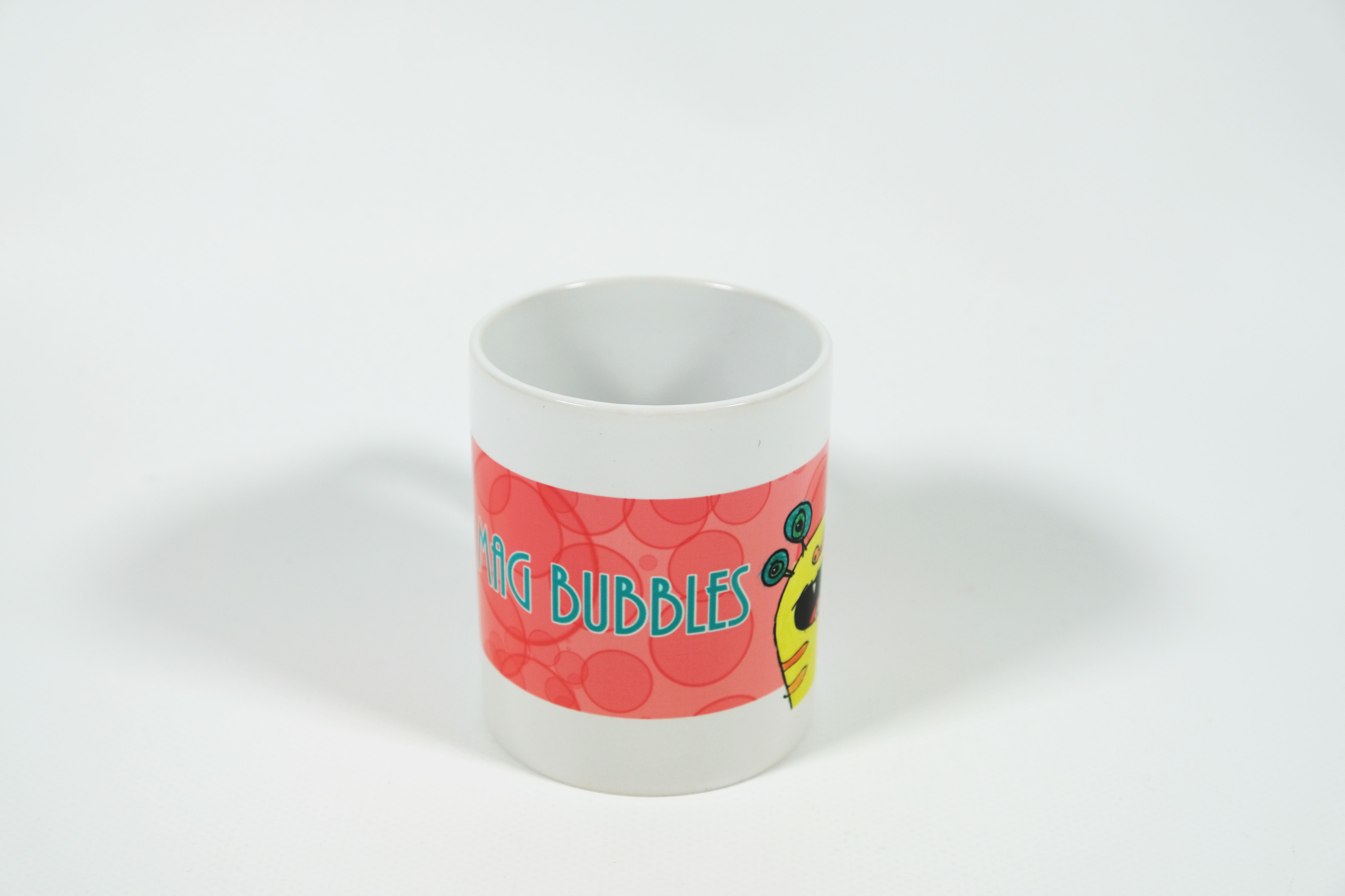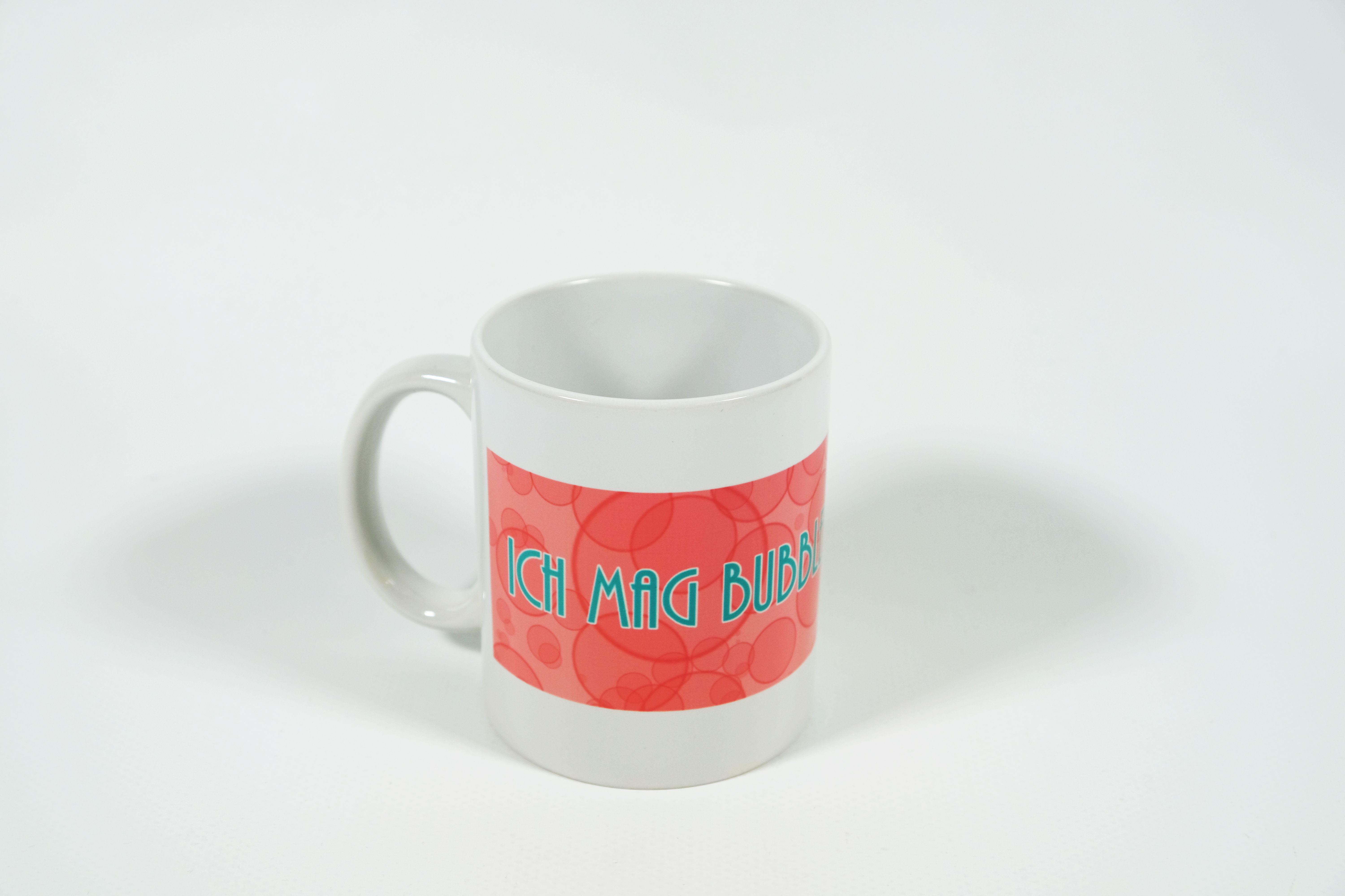 Diese weisse Tasse hat ein aufgedrucktes gelbes Monster mit vier grünen Augen und einem offenen Mund mit vier kleinen spitzen Zähnen. Dieses Motiv wurde von unseren Klienten/innen gezeichnet. Das Monster steht vor einem rosaroten Hintergrundstreifen, in dem es viele rosa «Bubbles» hat. Darin ist der hellblaue Schriftzug «Ich mag Bubbles» aufgedruckt.
