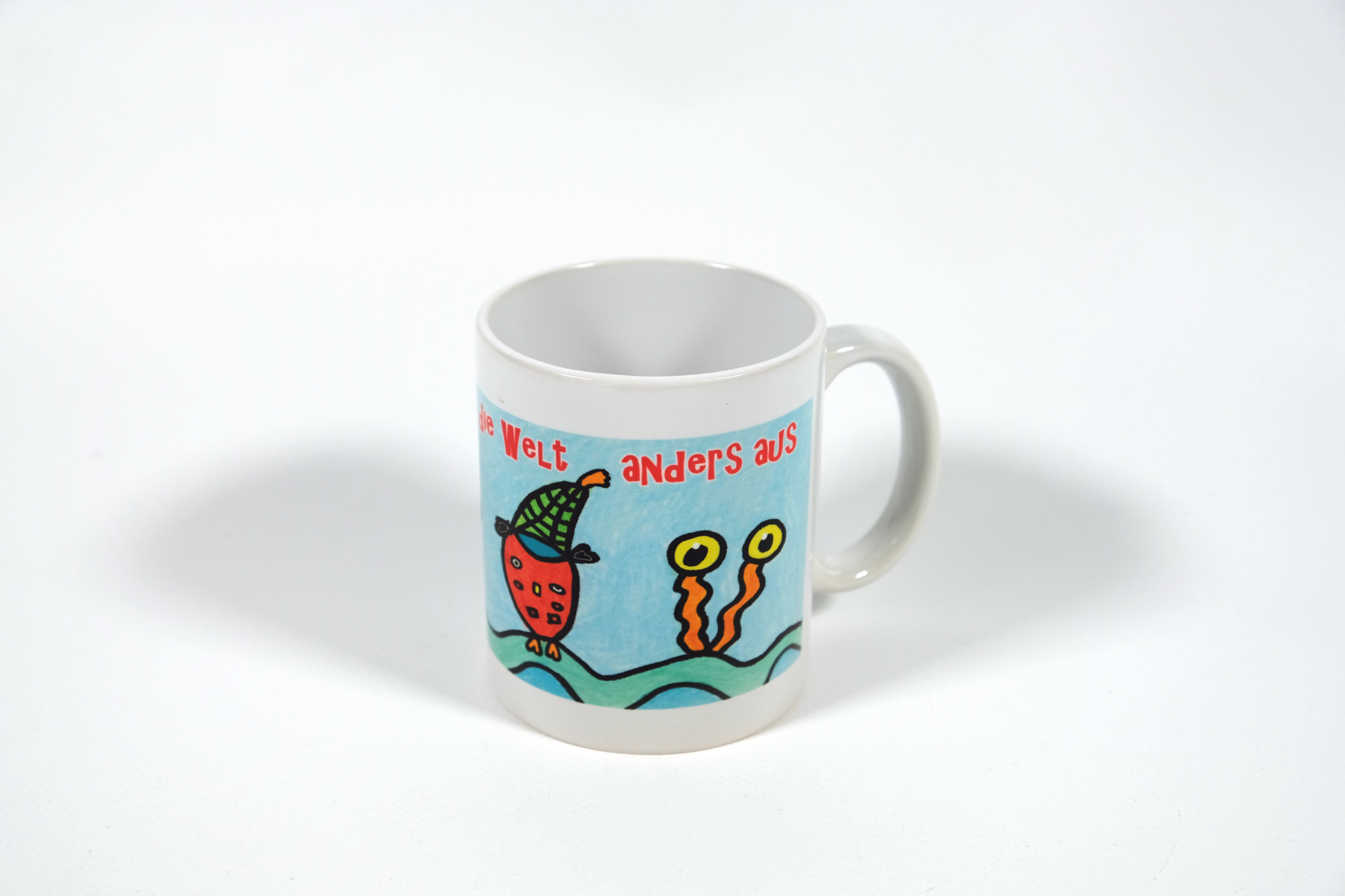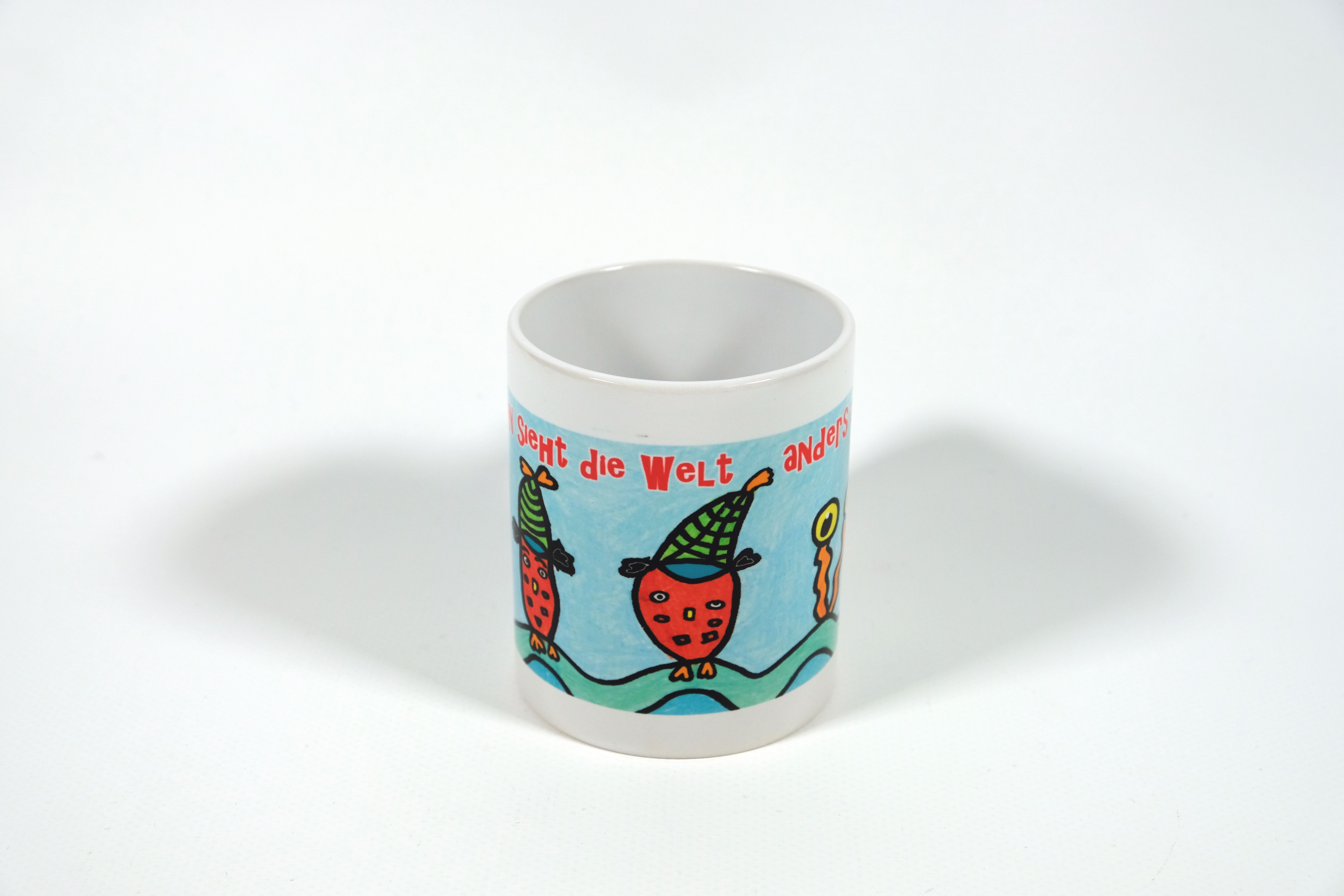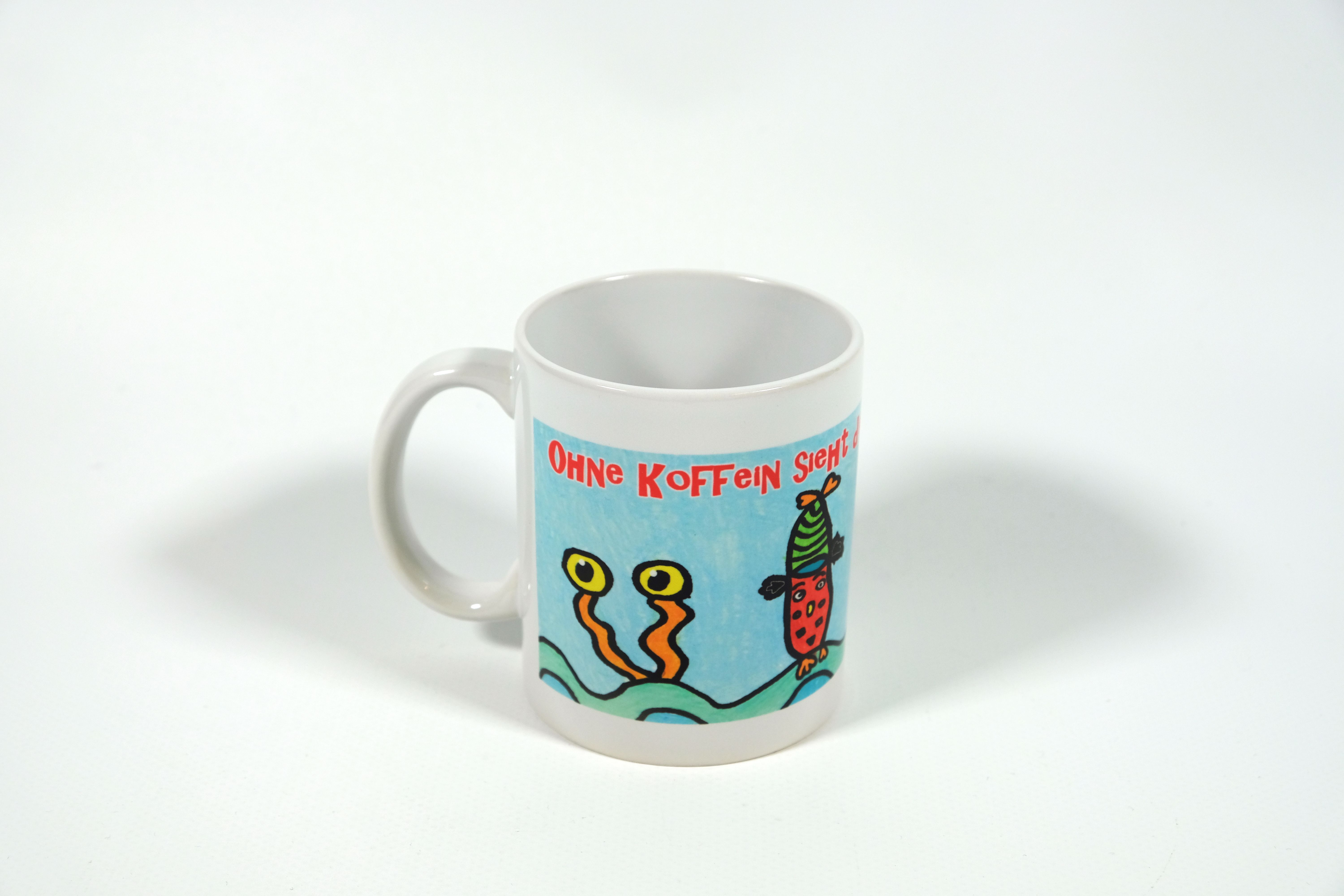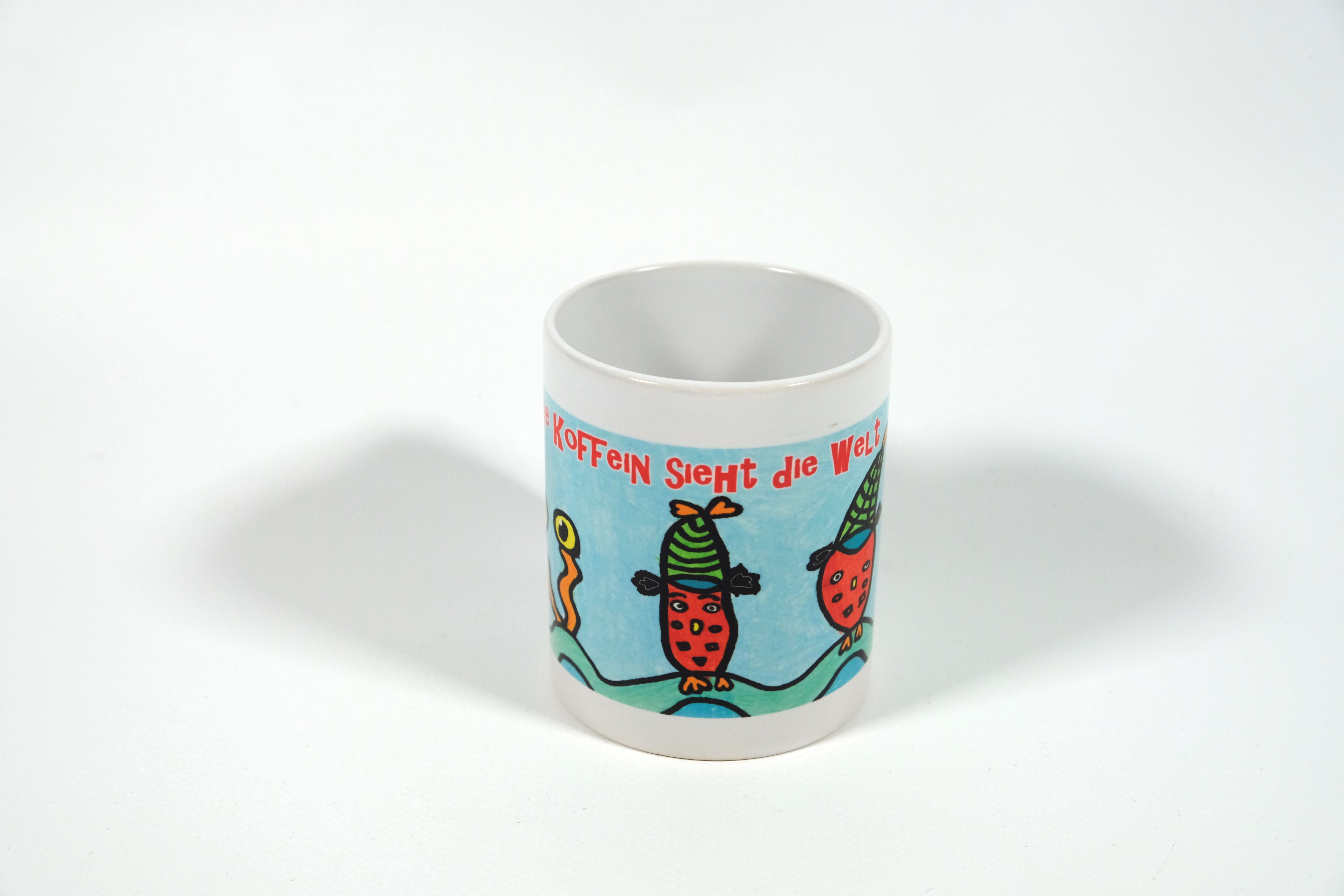 Diese Tasse hat ein aufgedrucktes Fantasie Bild mit komischen Vögeln und Schnecken. Das Motiv wurde von unseren Klienten/innen gezeichnet. Darüber ist der rote Schriftzug «Ohne Koffein sieht die Welt anders aus» aufgedruckt.