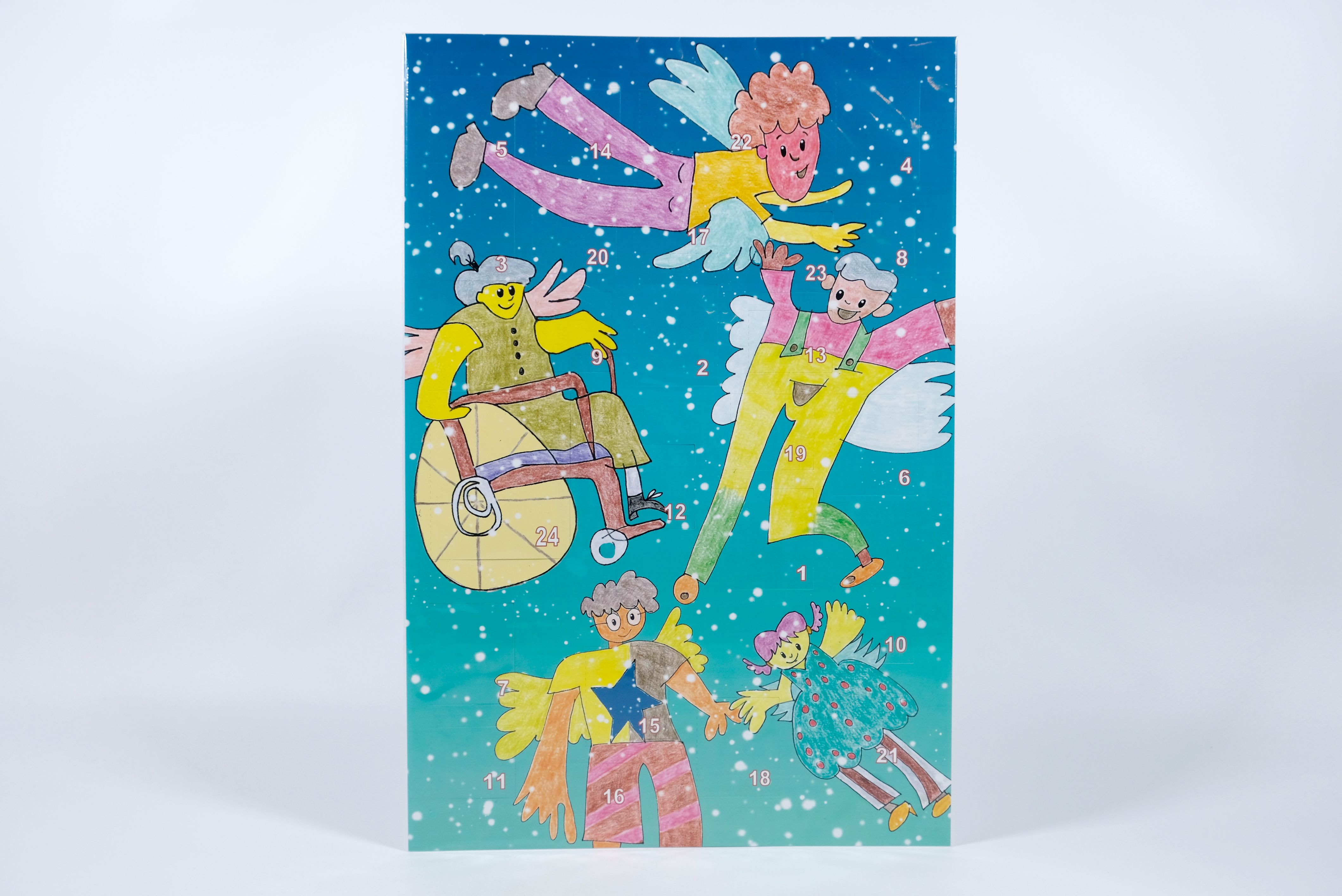 Dieser Weihnachtskalender zeigt fünf Engel mit einer Beeinträchtigung. Einer sitzt im Rollstuhl, einem fehlt eine Hand, die restlichen haben zum Teil verformte Gliedmassen. Alle fliegen in der Luft und um sie herum schneit es. Dieses Deckblatt wurde von unseren Klient*innen entworfen und angemalt und soll die Inklusion auch unter Engeln darstellen.