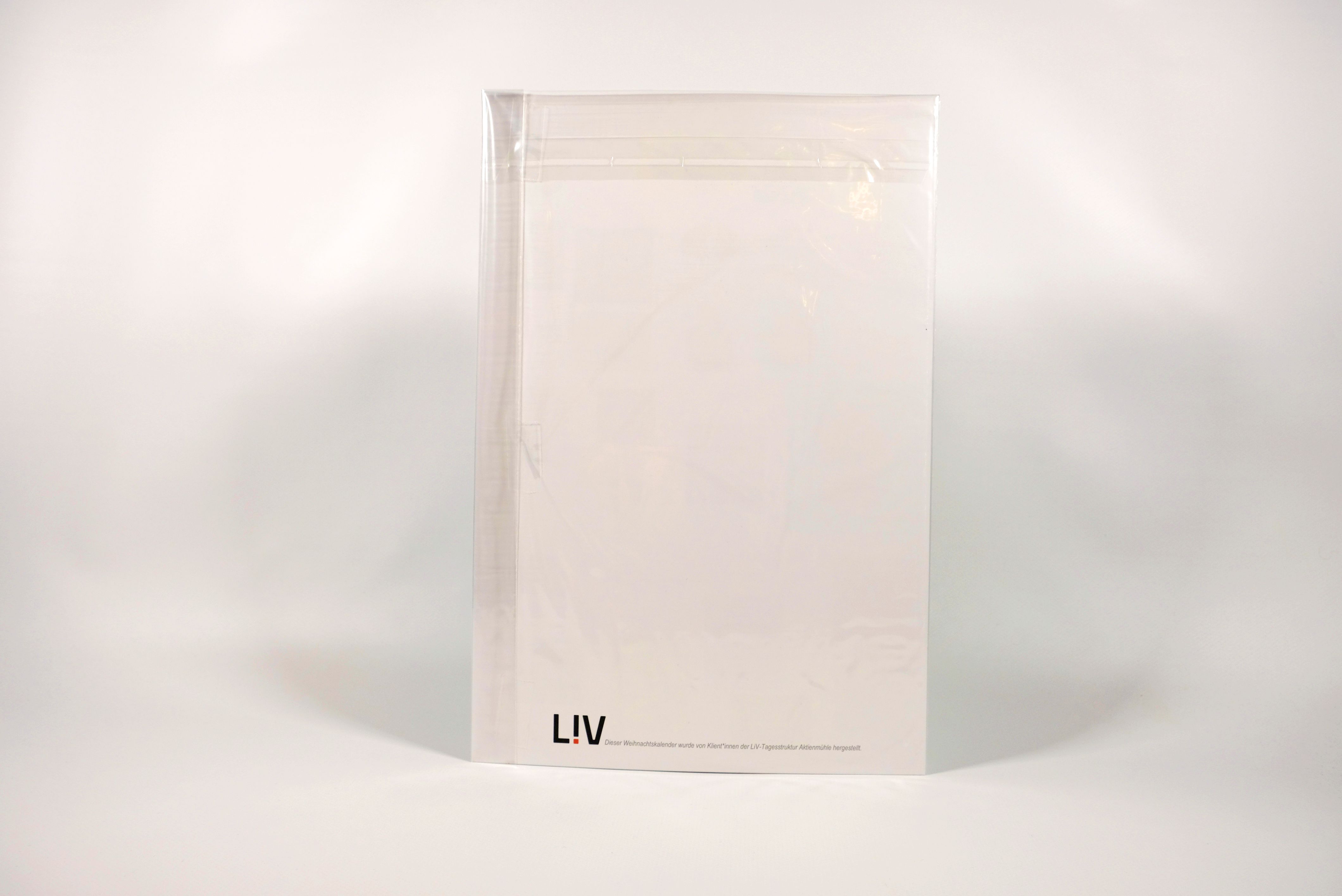 Die Sprüche und Bilder hinter den 24 Türchen sind durch unsere Klient*innen gemalt oder geschrieben worden. Auf der Rückseite ist unser Logo "LiV Leben in Vielfalt" und ein Text abgedruckt der besagt wer und wo dieser Kalender hergestellt wurde.
