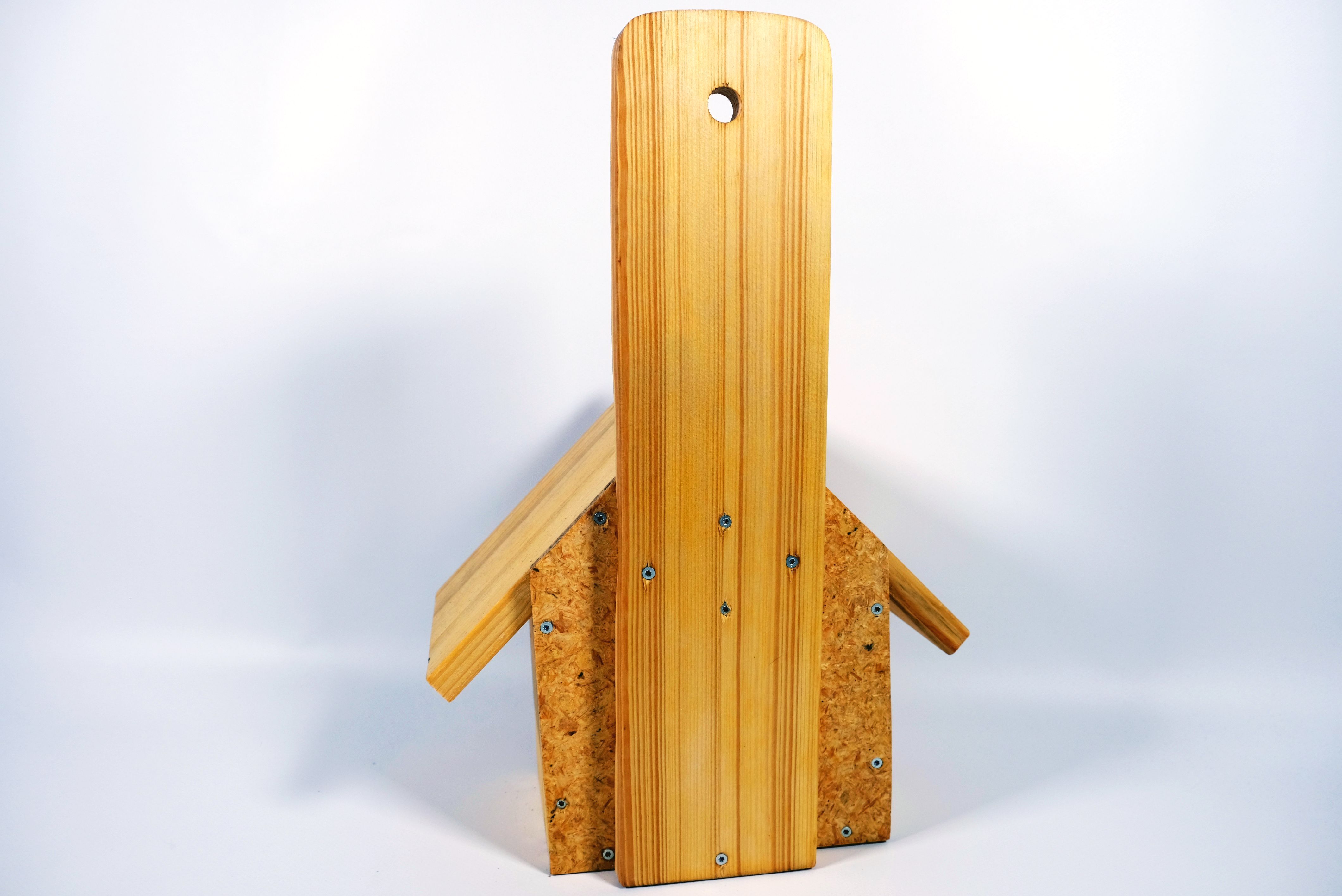 Dieses Insektenhotel wurde durch Klient*innen der Tagesstruktur Lehenmatt in der Holzwerkstatt hergestellt. Es ist ein kleines Holzhäuschen (Ca. 11cm Tiefe) mit Dach und eingelegten zugeschnittenen Holunderholzstäbchen. Der Gibel wurde silbern angemalt und das restliche Holz-Hotel ist mit Leinöl behandelt. An der Rückwand hat es eine Holzlatte, die das Häuschen überragt mit einem gebohrten Loch, an dem man es aufhängen kann.