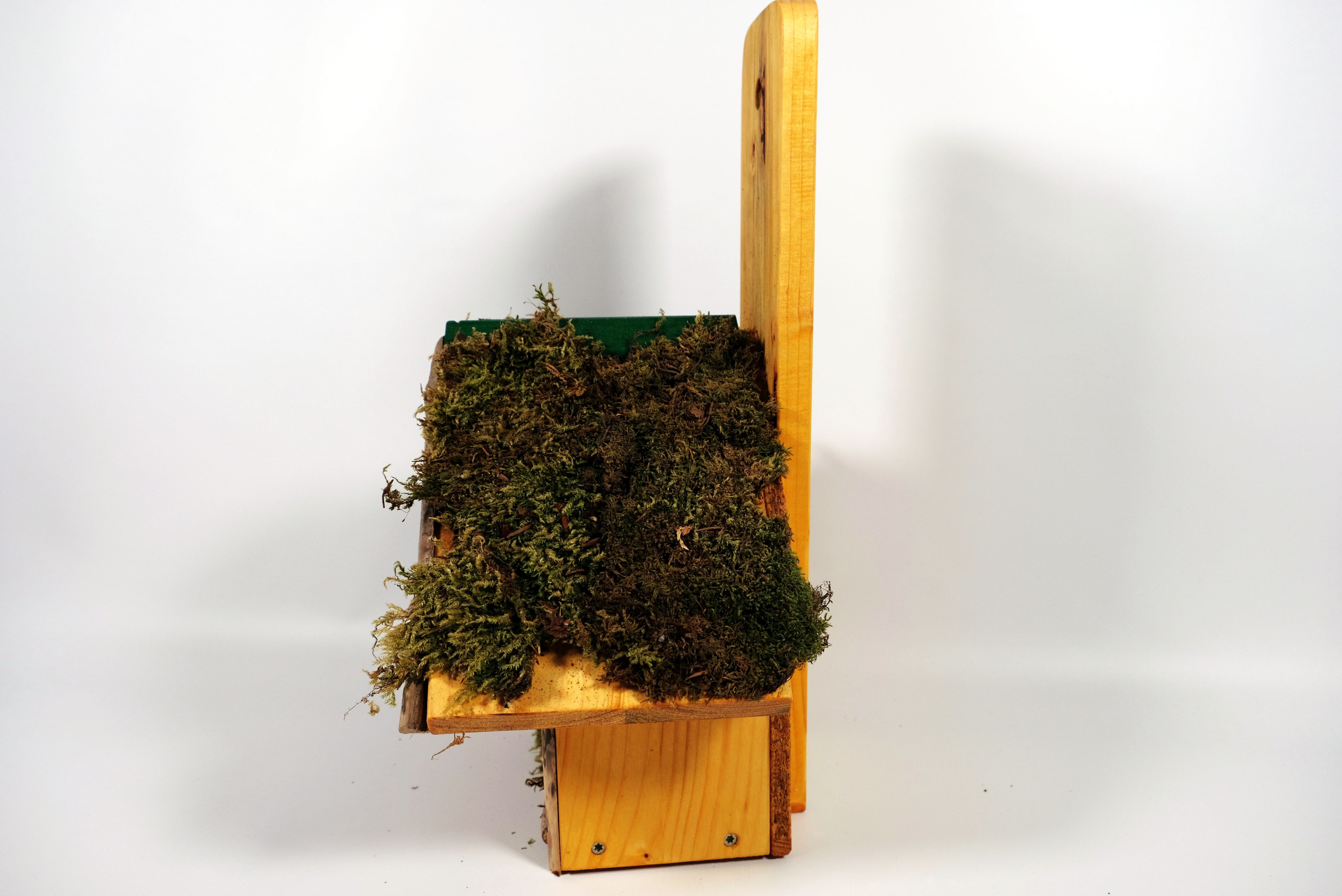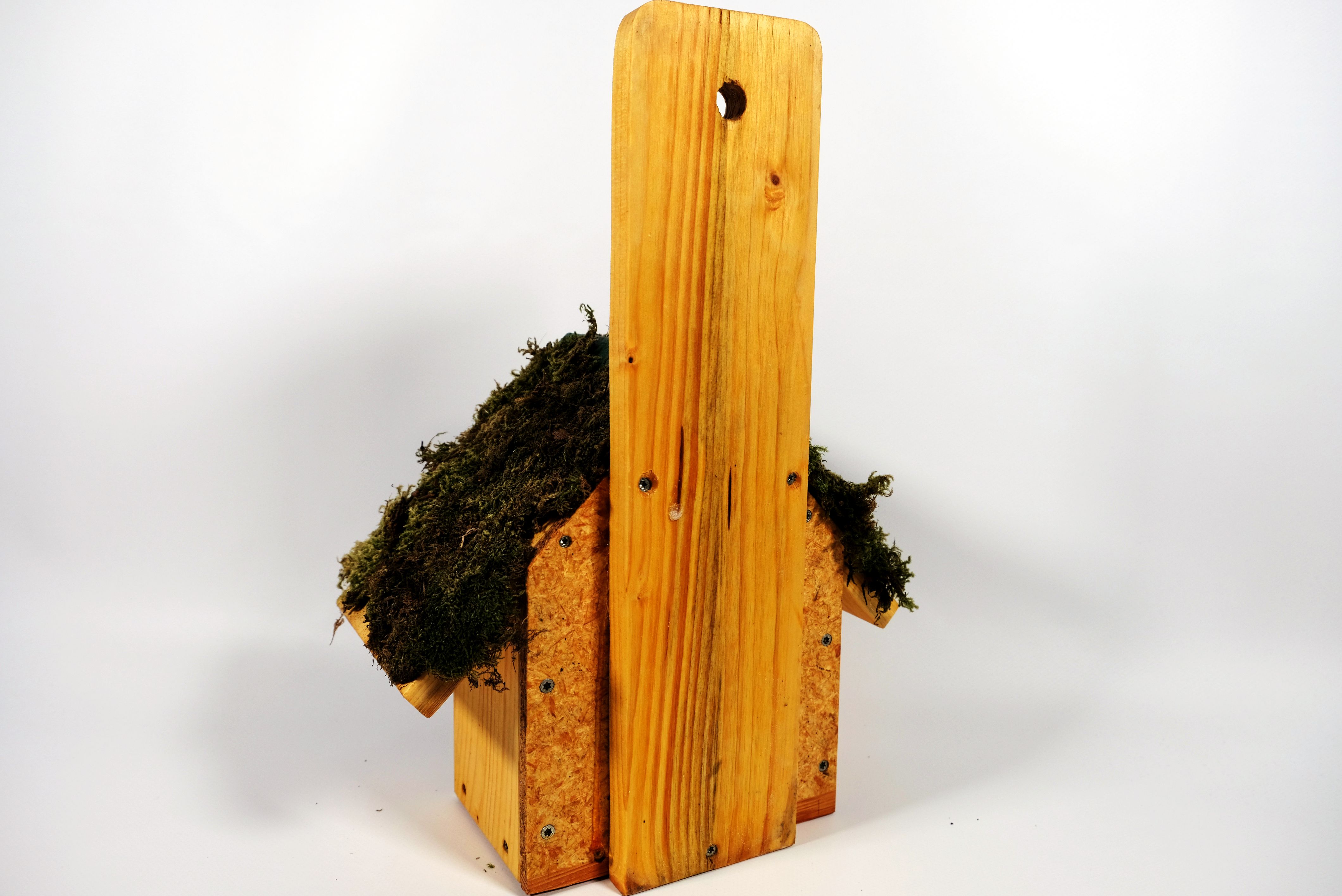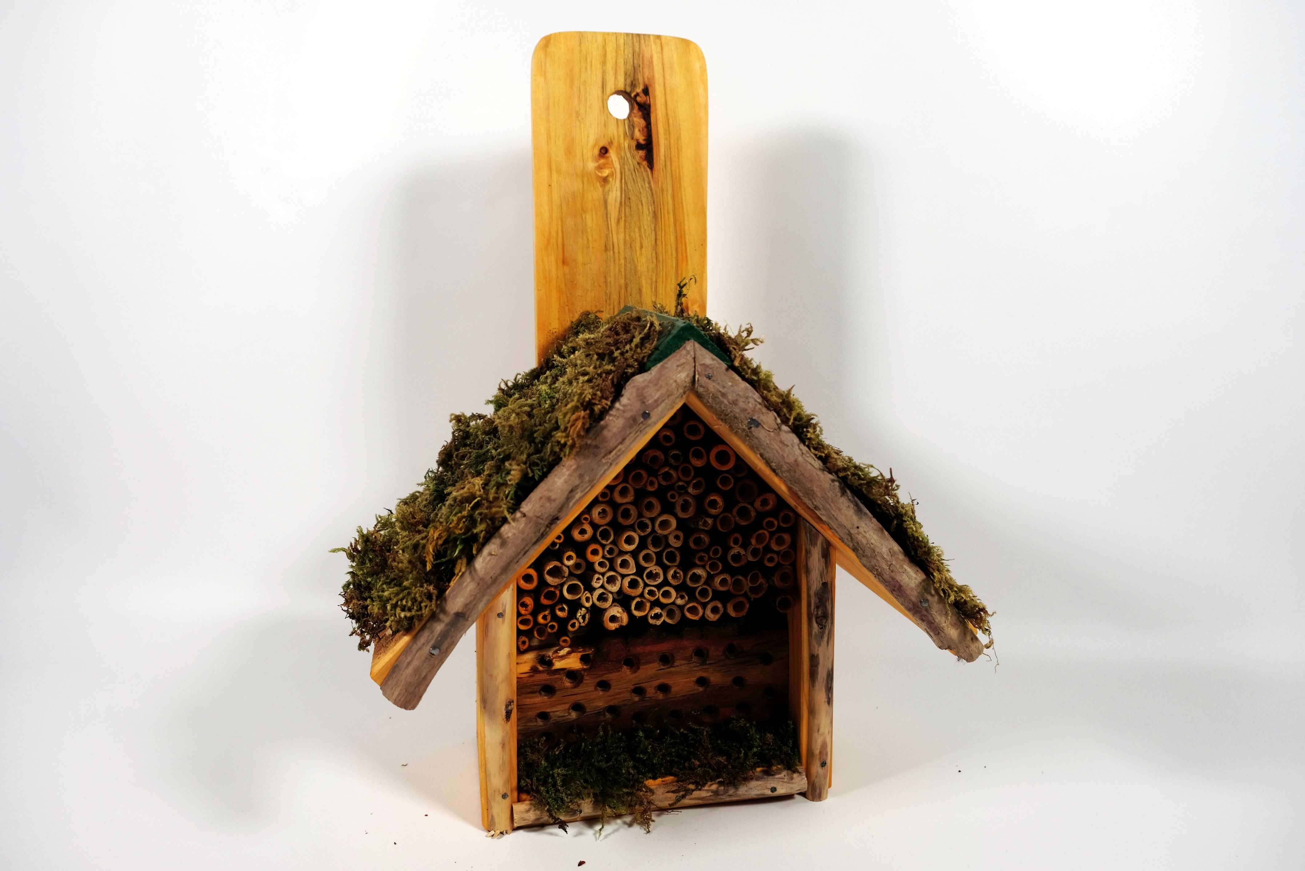 Dieses Insektenhotel wurde durch Klient*innen der Tagesstruktur Lehenmatt in der Holzwerkstatt hergestellt. Es ist ein kleines Holzhäuschen (Ca. 11cm Tiefe) mit Dach und eingelegten zugeschnittenen Holunderholzstäbchen. Das Dach wurde mit Moos verziert und die Fronten mit Ästen verkleidet. Das restliche Holz-Hotel ist mit Leinöl behandelt. An der Rückwand hat es eine Holzlatte, die das Häuschen überragt mit einem gebohrten Loch, an dem man es aufhängen kann.