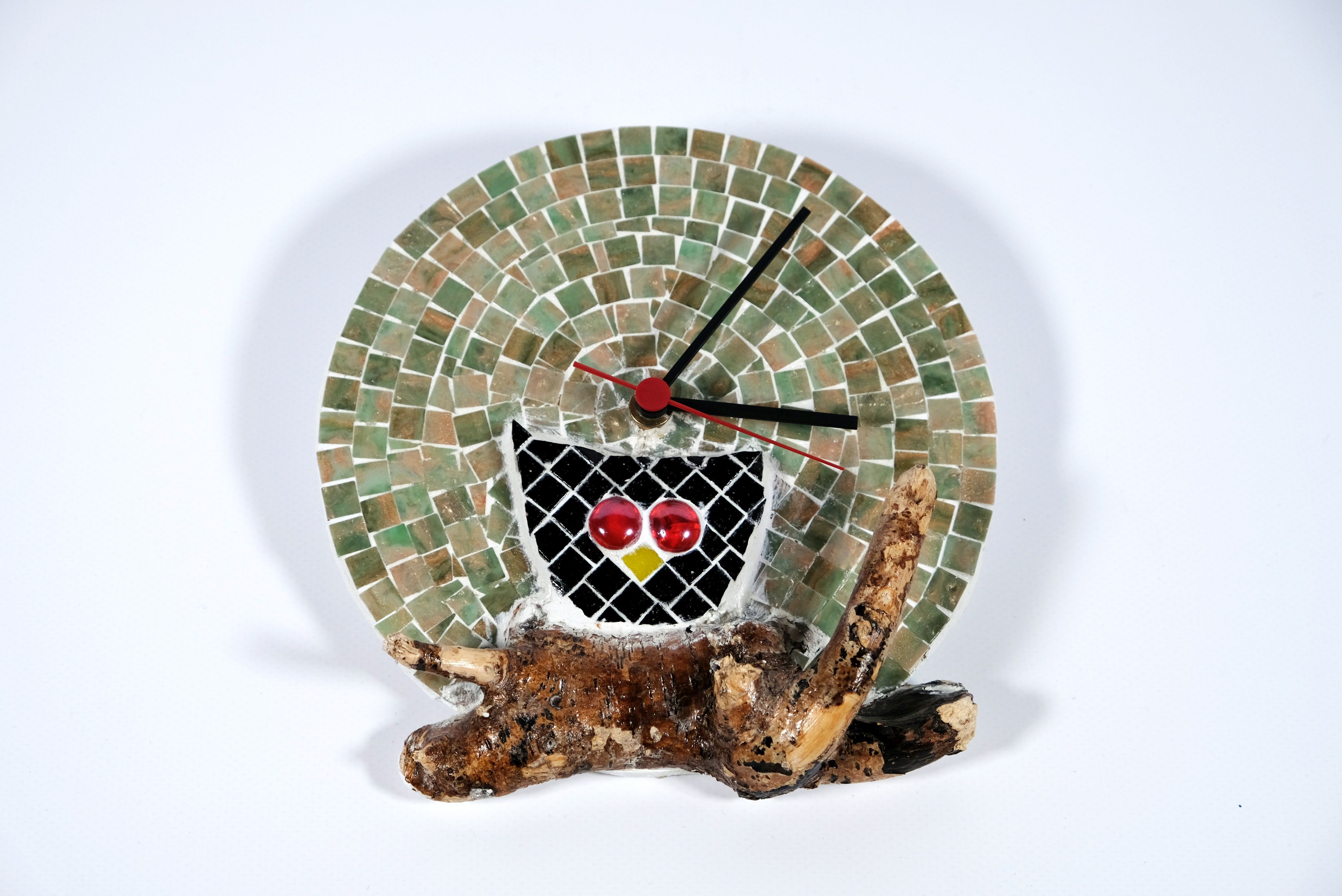 Diese Mosaik-Uhr wurde von Klienten der Tagestruktur Aktienmühle hergestellt. Sie besteht aus einer flachen kreisrunden Sperrholzscheibe, die mit günen Mosaiksteinen beklebt wurde. Davor sitzt eine schwarze Eule mit gelbem Schnabel und roten Augen auf einem Ast. Der Ast ist ein Wurzelholz, das aufgeklebt wurde.