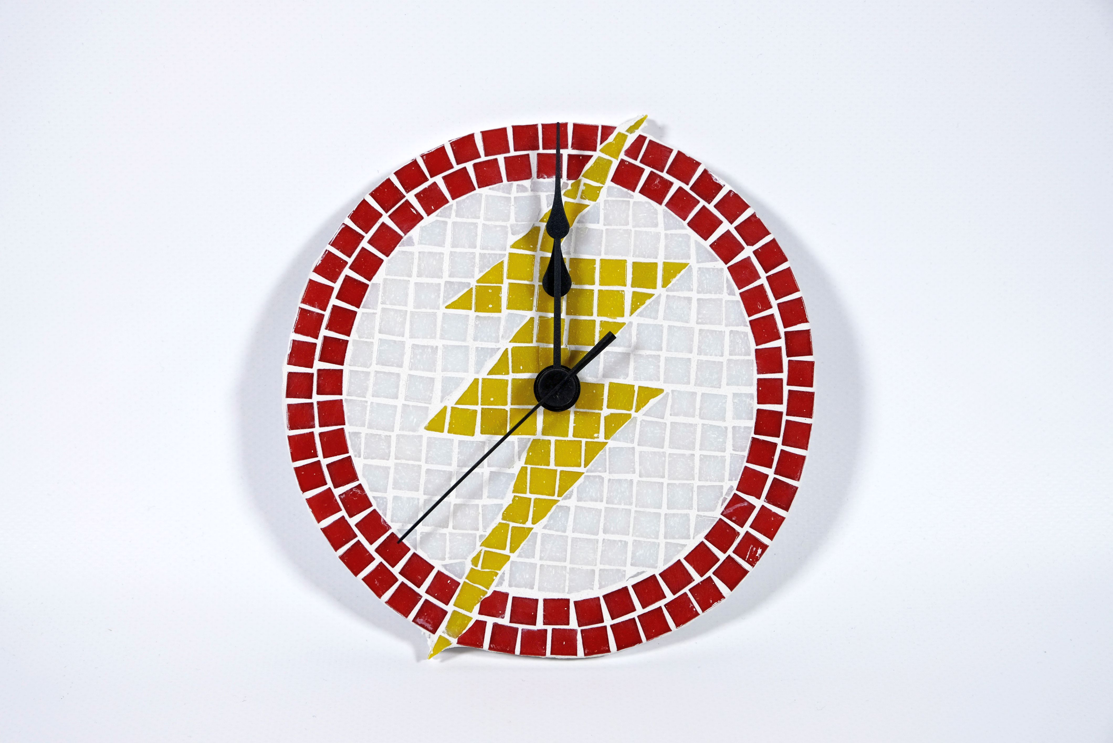 Diese Mosaik-Uhr wurde von Klienten der Tagesstruktur Aktienmühle hergestellt. Sie besteht aus einer flachen Sperrholzscheibe auf der die Mosaiksteine aufgeklebt sind. Sie hat einen roten Rand einen weissen Hintergrund und in der Mitte hat es einen gelben Blitz.