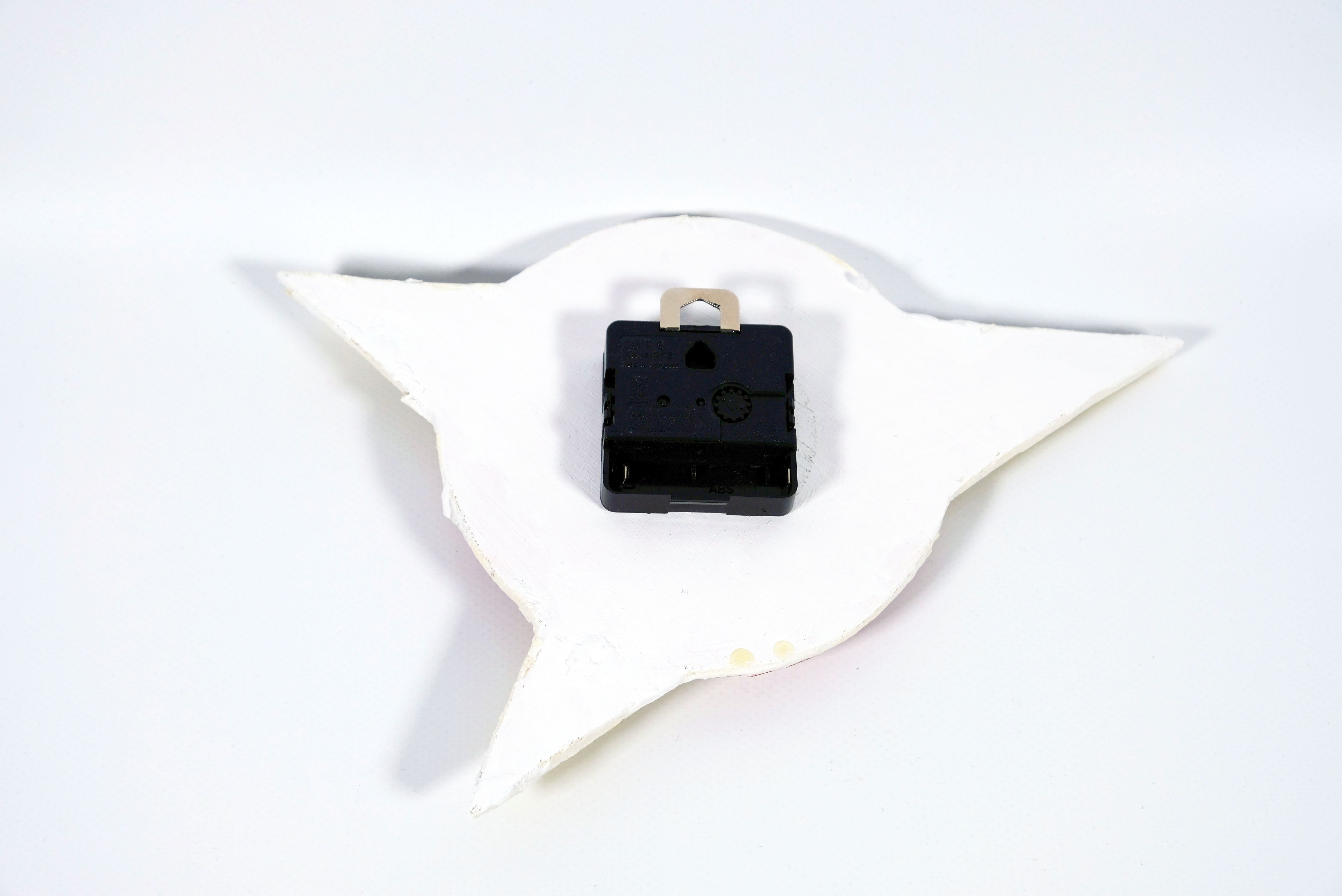 Diese Mosaik-Uhr wurde von Klienten der Tagesstruktur Aktienmühle hergestellt. Sie besteht aus einer flachen Sperrholzscheibe die durch einen dreizackigen Stern durchzogen wird. Der Stern besteht aus einer Linie gelber Mosaiksteine. Dahinter hat es einen rot-weissen Ring und einen hellblauen Hintergrund.