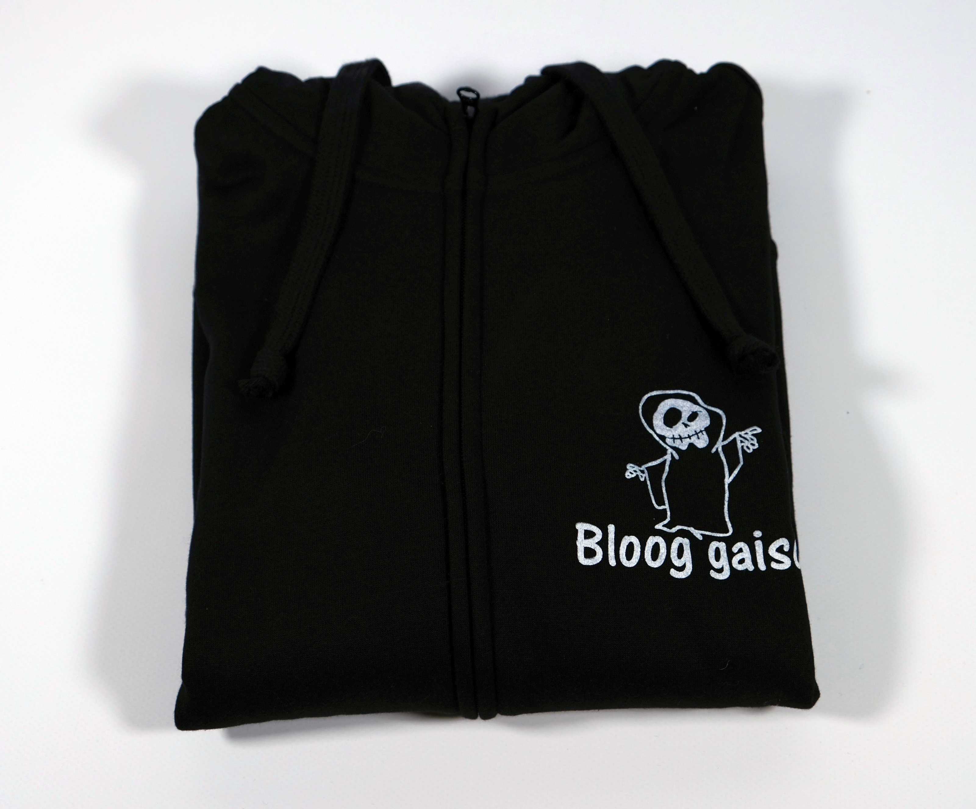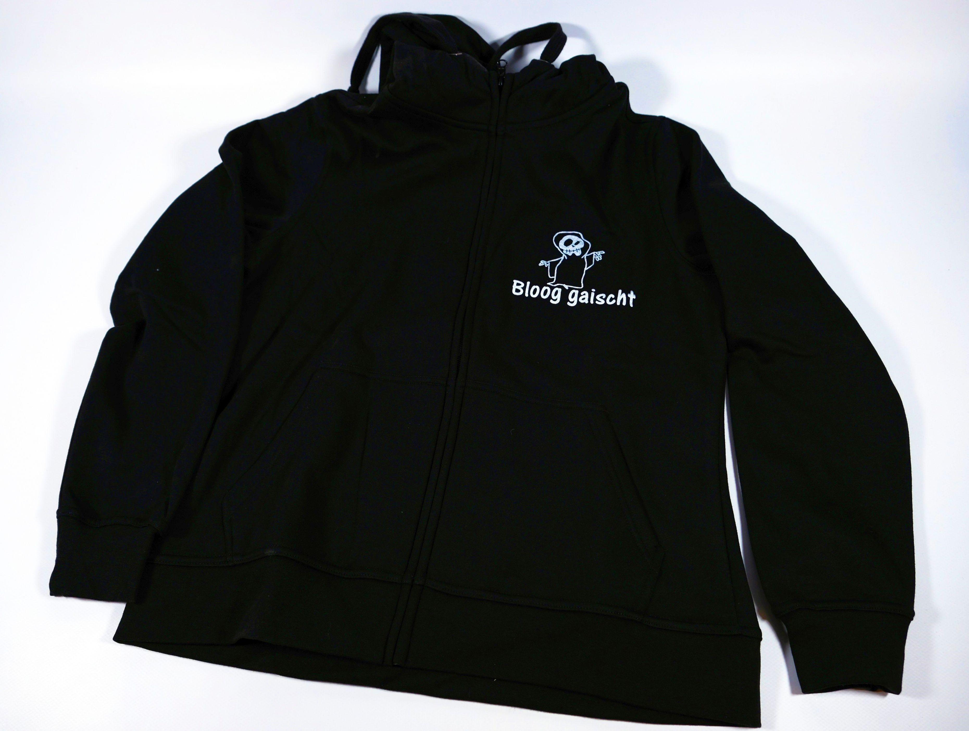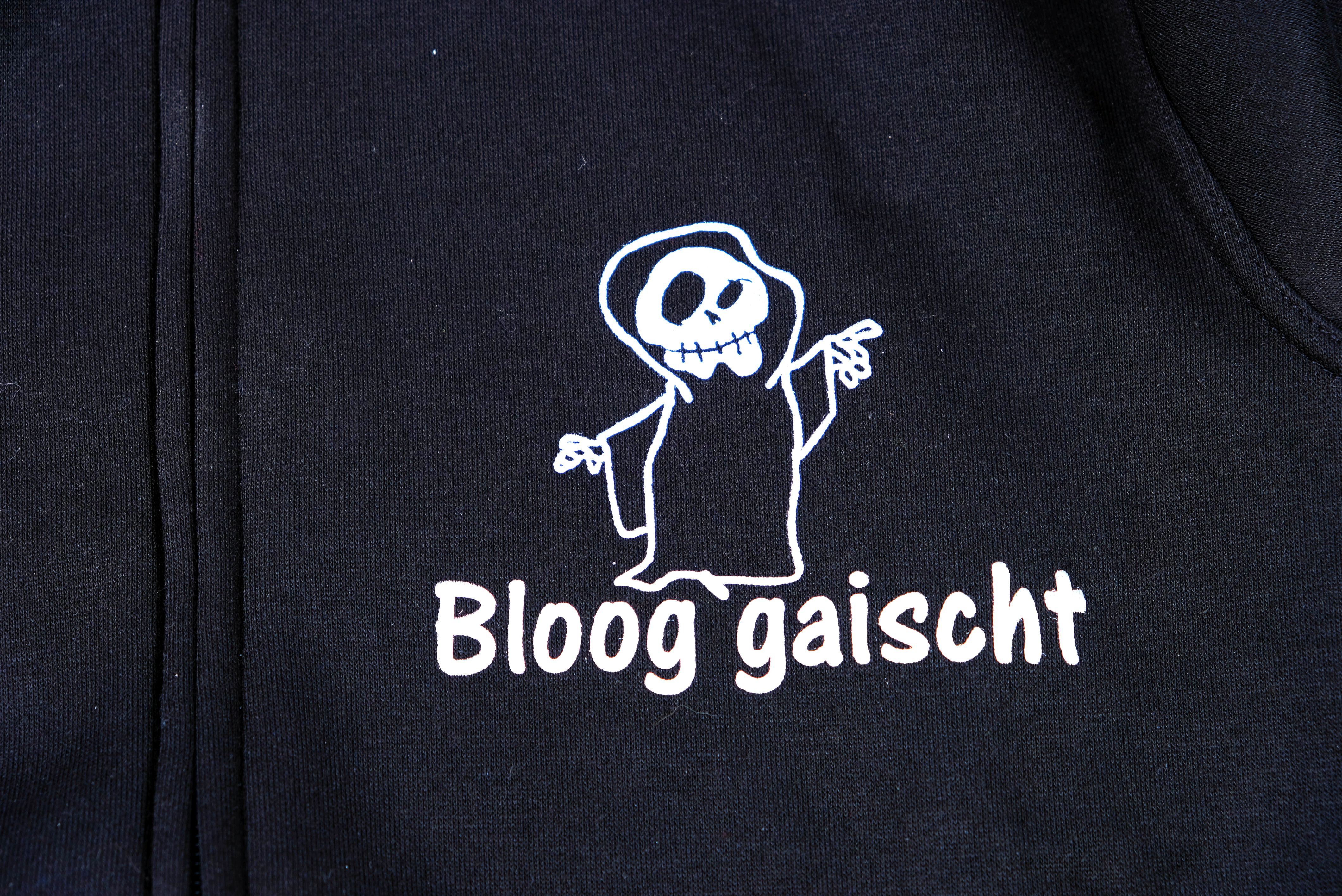 Dieser Hoodie - sprich Kaputzenpullover ist schwarz und hat einen weissen Aufdruck. Es ist ein kleiner Geist mit Totenkopfgesicht, der mit dem Zeigefinger nach oben zeigt. Darunter ist der Schriftzug "Bloog`gaischt" aufgedruckt. Er ist auf der linken Brustseite aufgedruckt, da dieser Hoodie einen Zip hat.