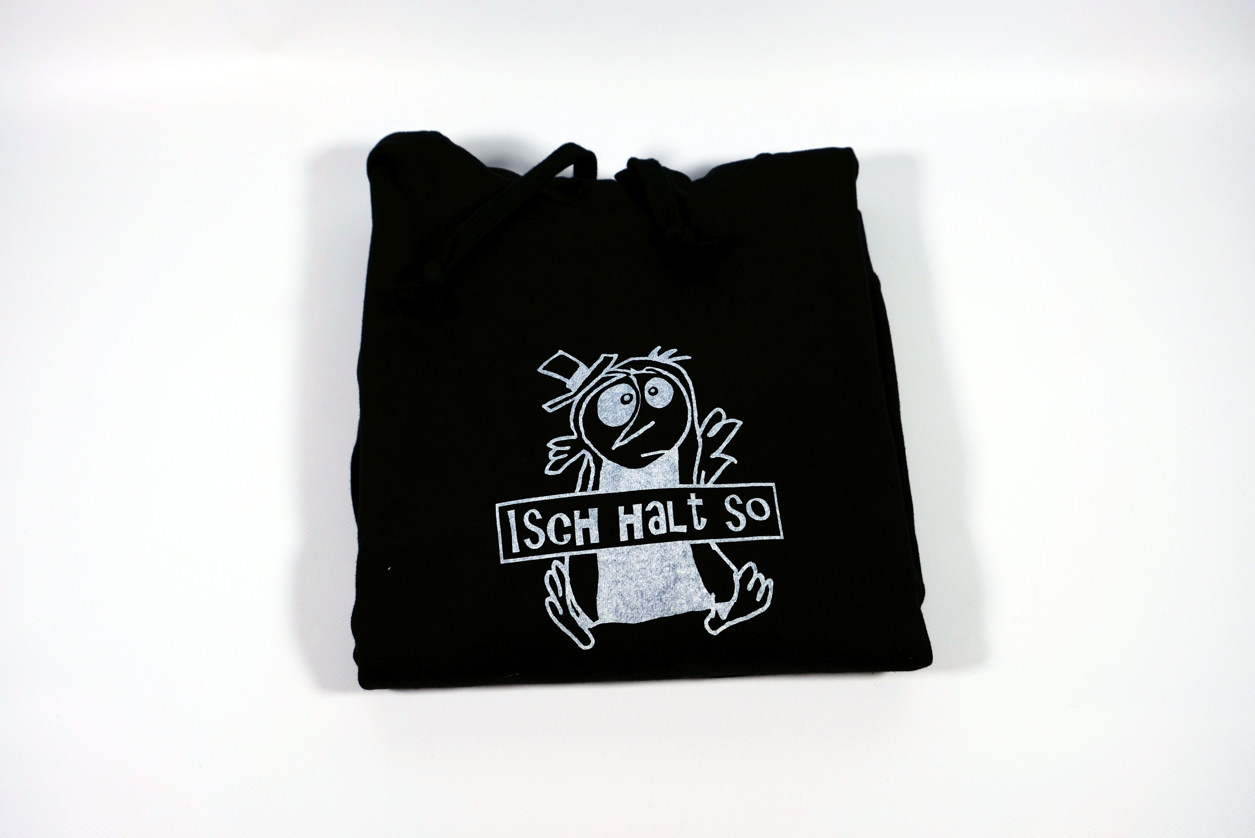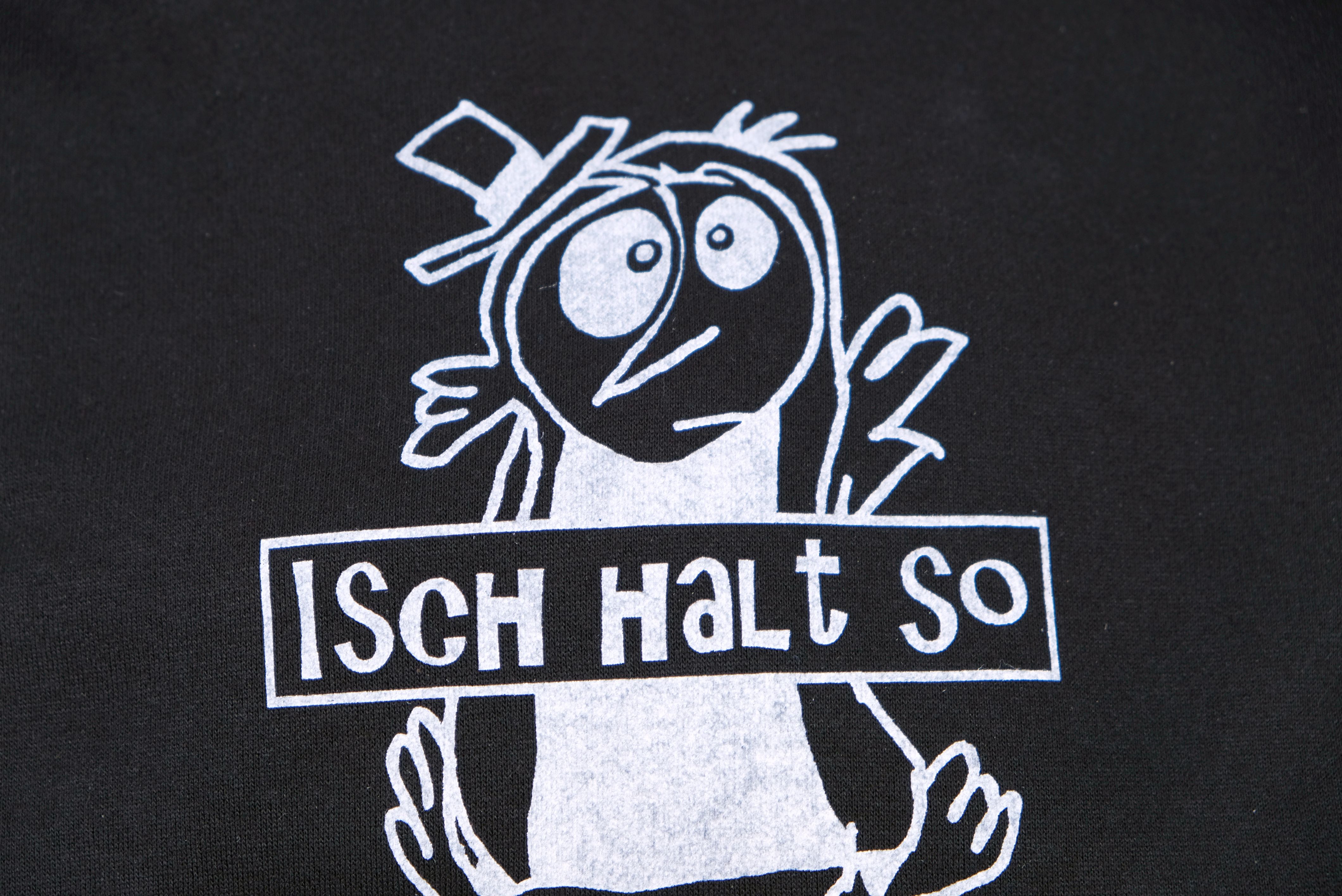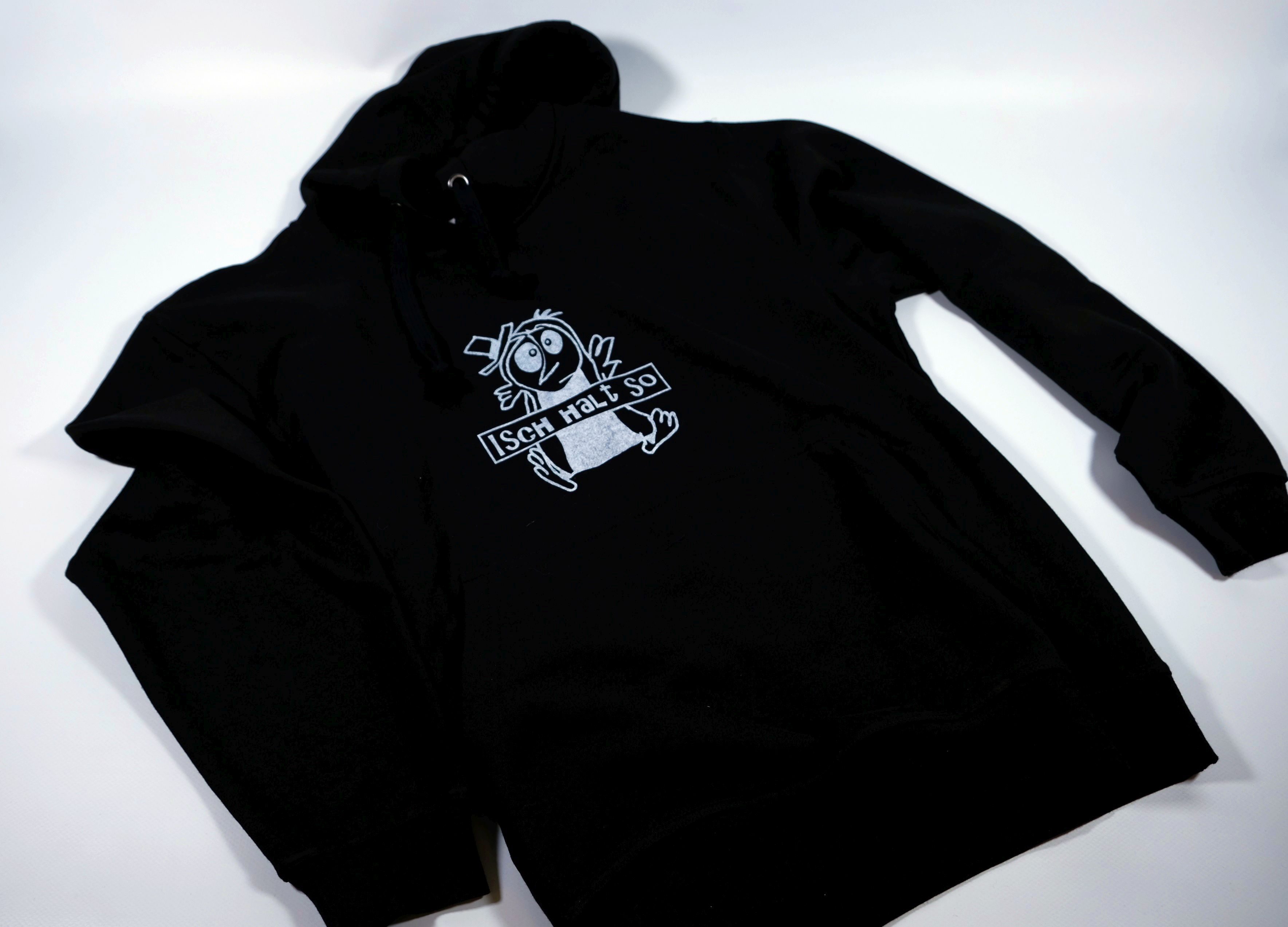 Dieser Hoodie - sprich Kaputzenpullover ist schwarz und hat einen weissen Aufdruck. Es ist ein Pinguin mit Hut und über seinem Bauch ist der Schriftzug "Isch halt so" in einer Kartusche aufgedruckt.