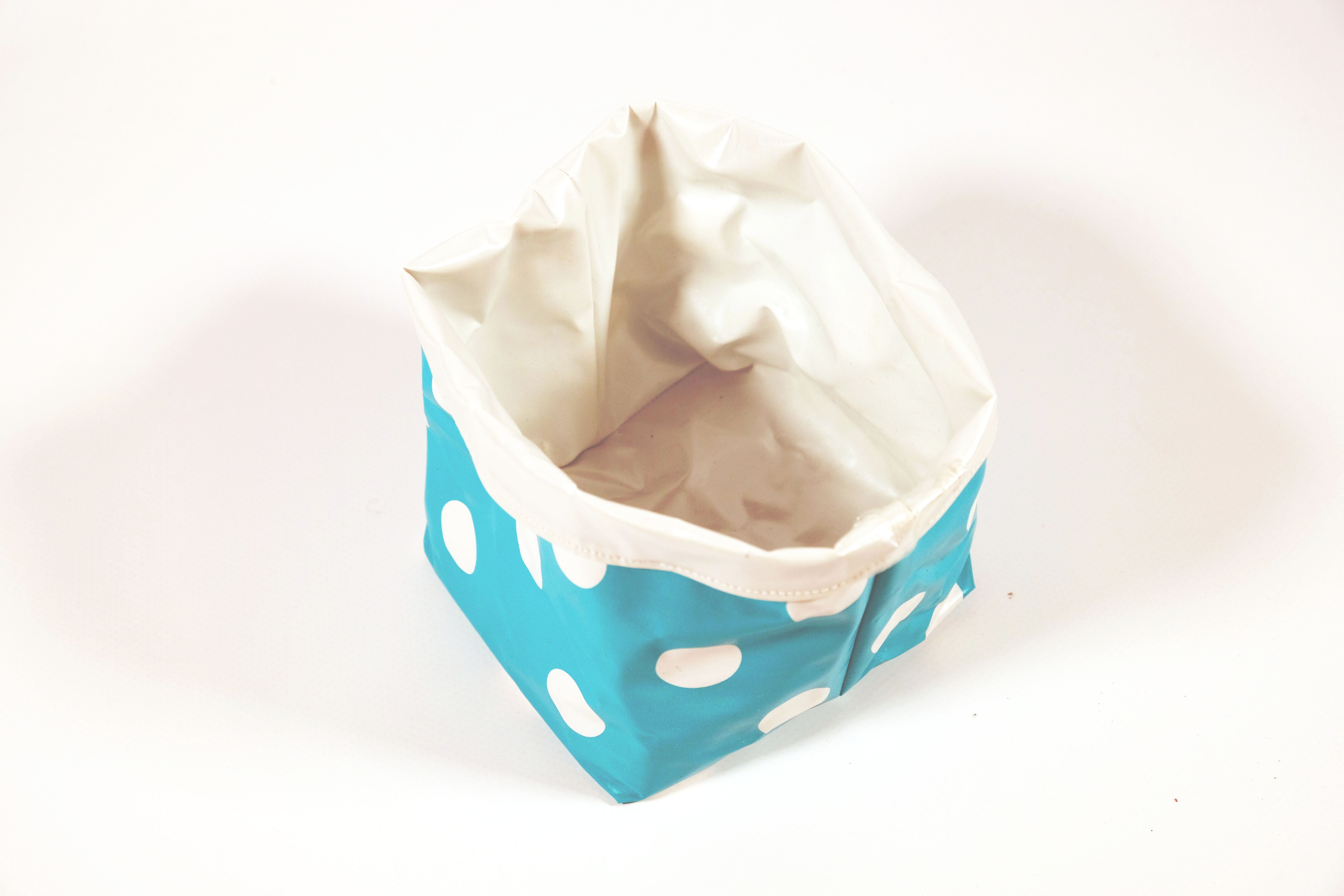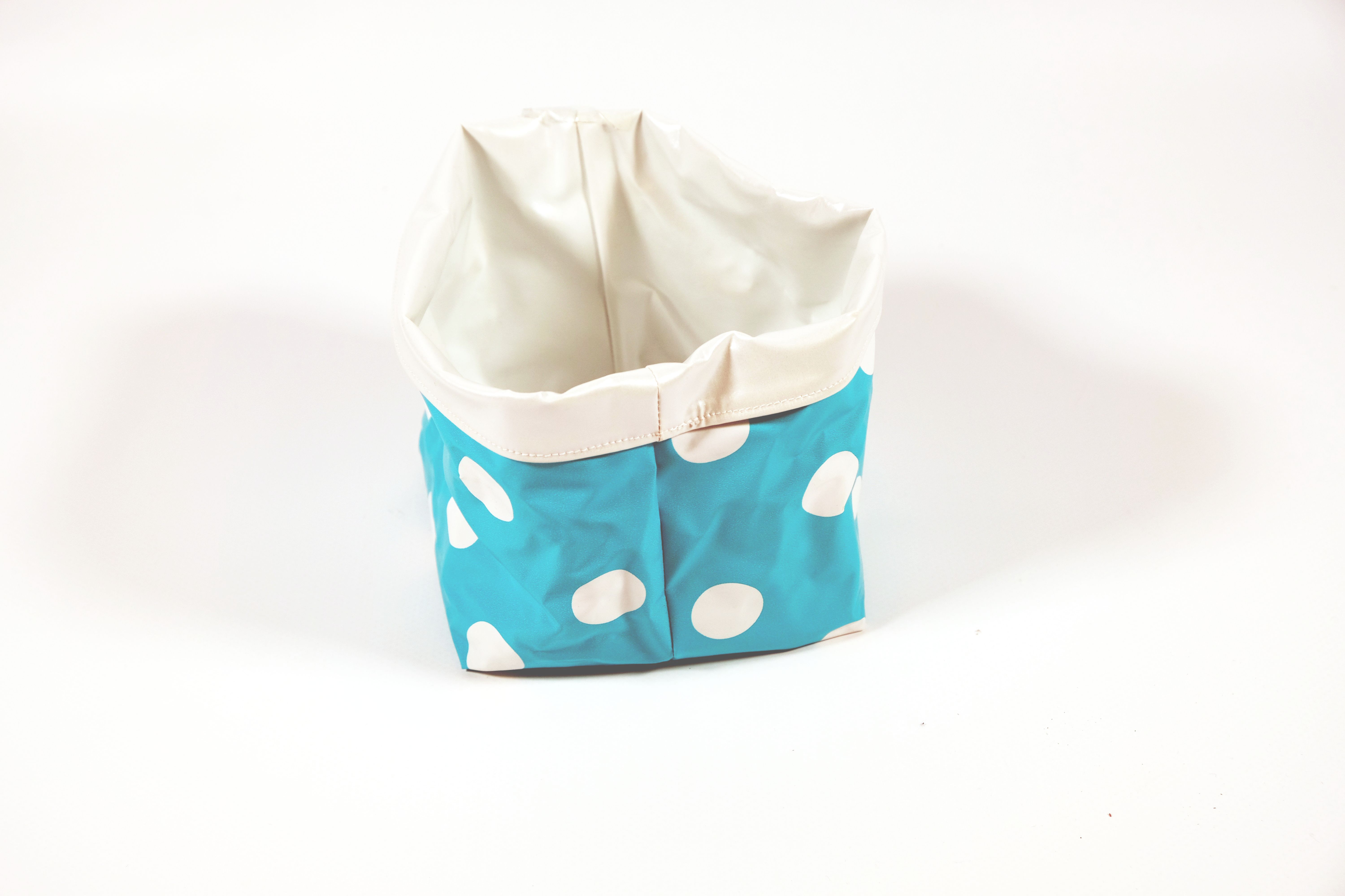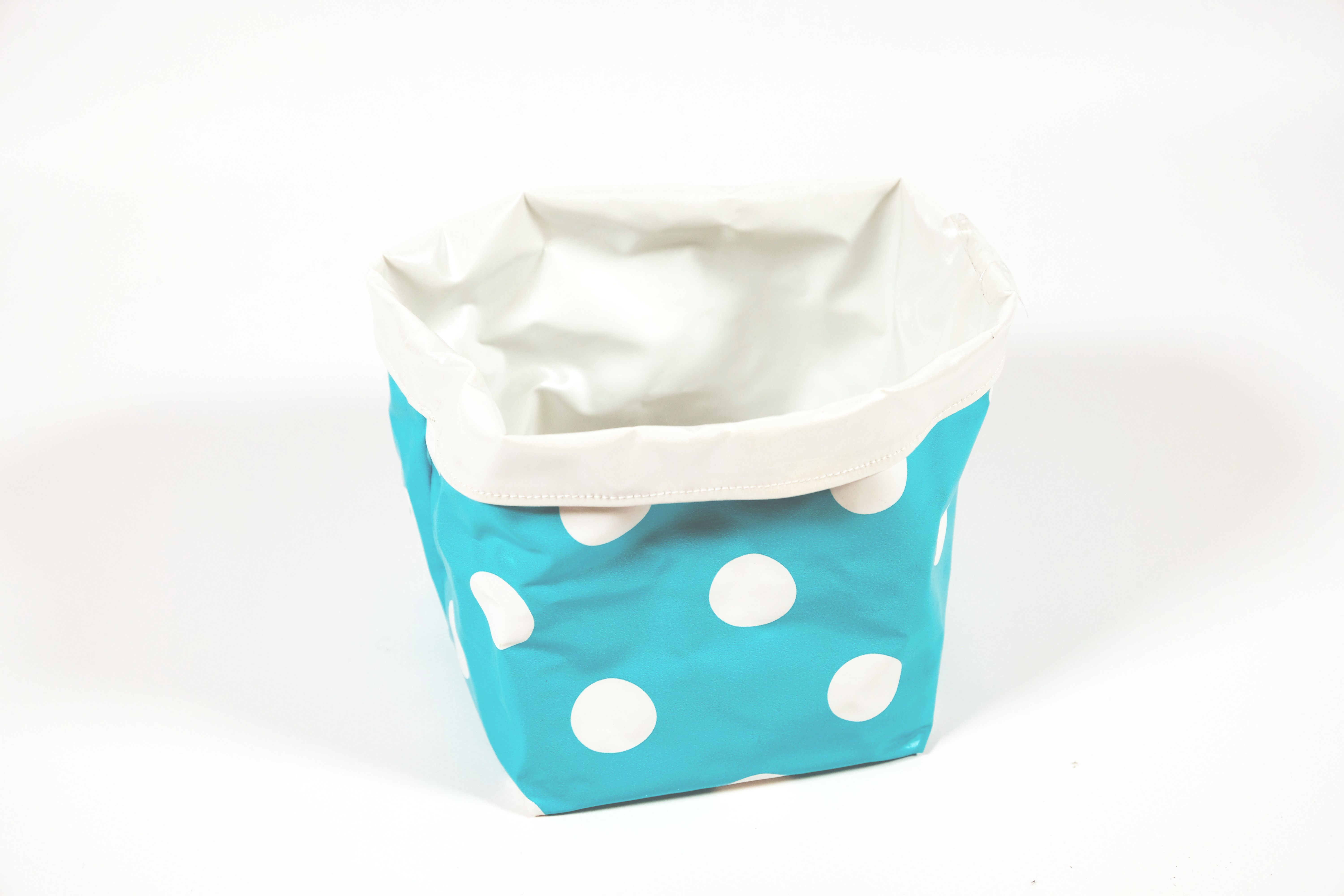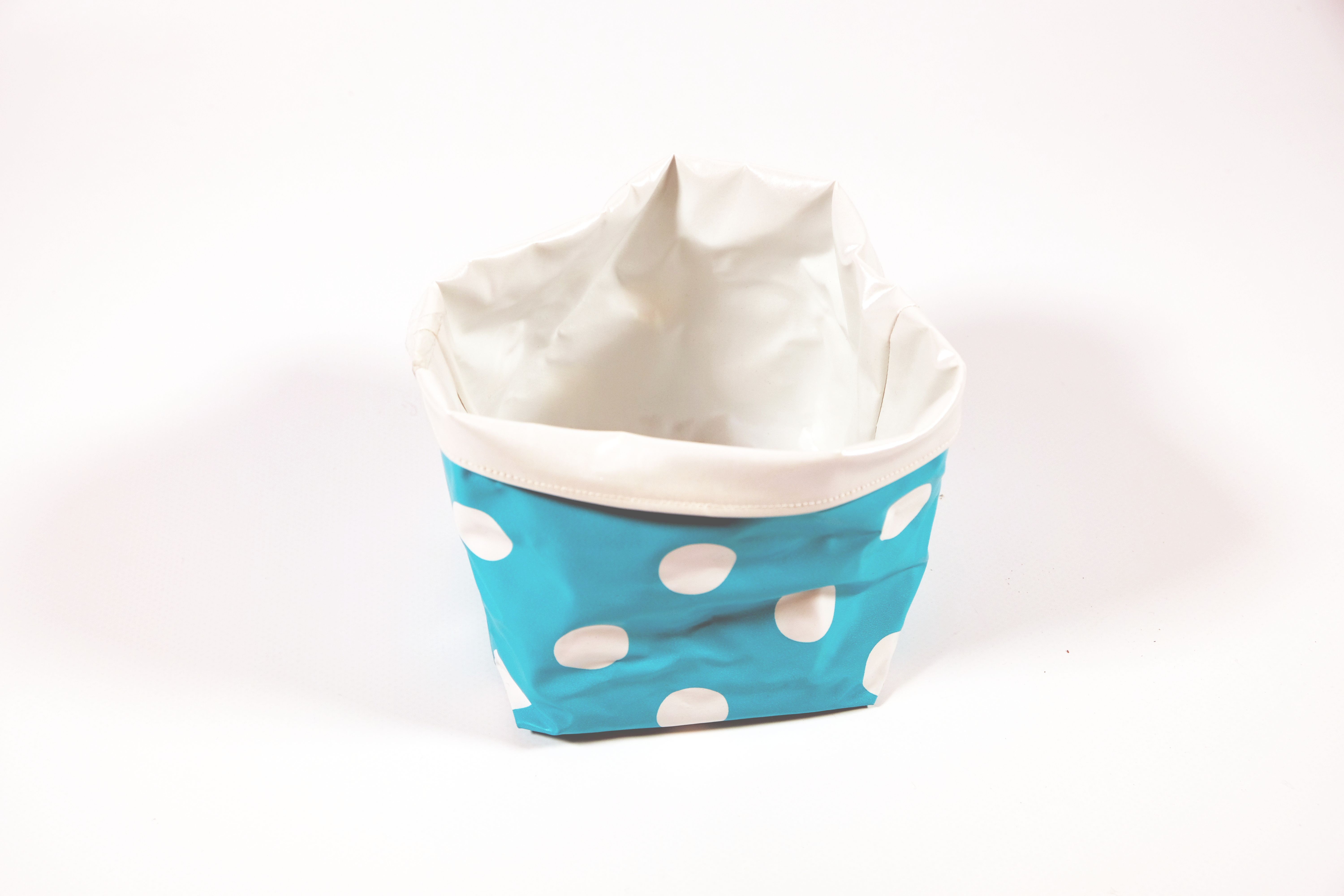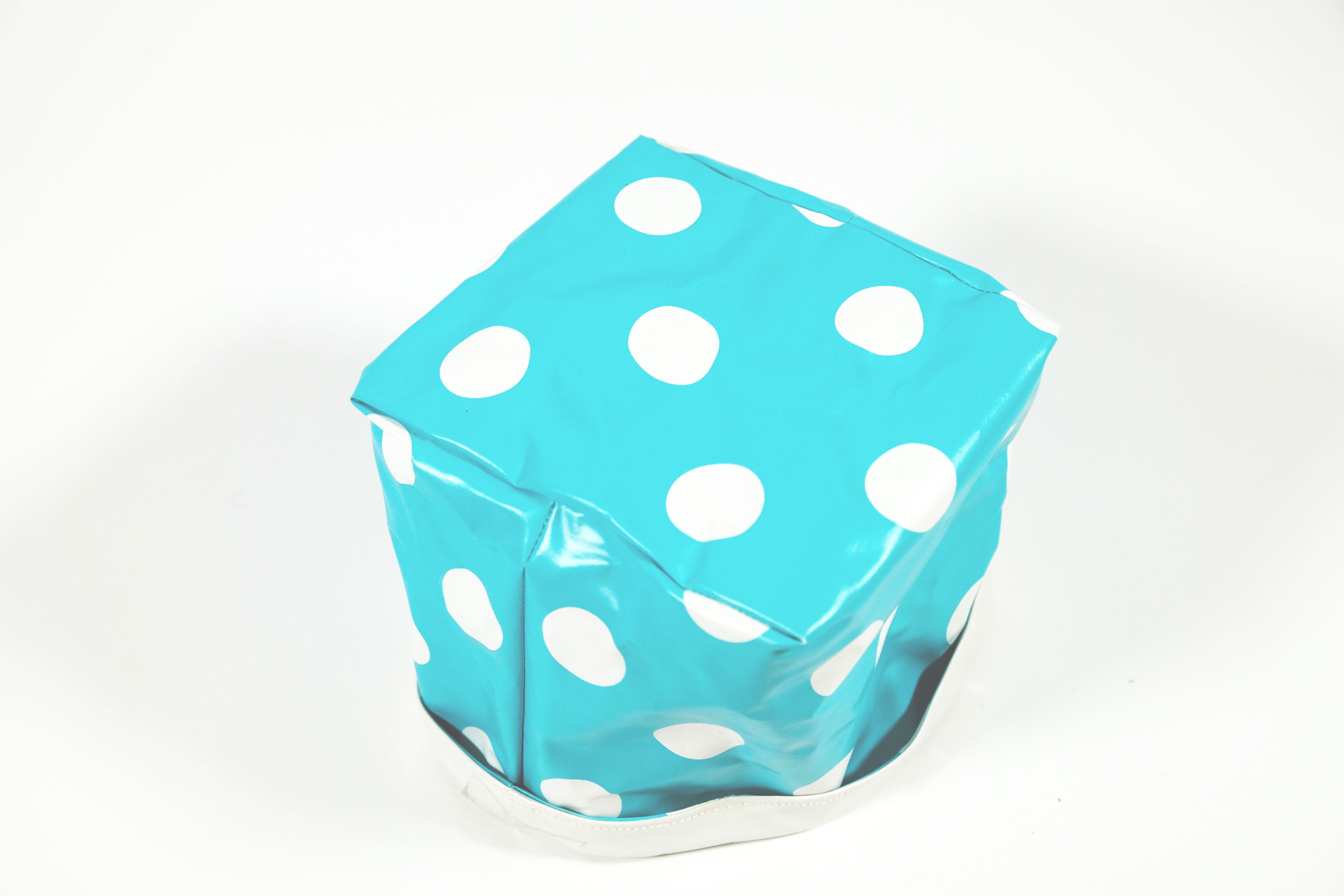 Diese Aufbewahrungsbox Namens «Cube» wurde aus einem Plastikwachstuch von Klienten*innen im Nähatelier der Tagesstruktur Lehenmatt gemacht. Aussen ist die Box hellblau mit grossen weissen Punkten und innen ist sie weiss. Es kann alles Mögliche darin aufbewahrt werden. Die Box kann nach Belieben auch auf die andere Seite gekehrt werden, so dass die weisse Farbe aussen und die hellblaue mit weissen Punkten nach innen gerichtet ist.