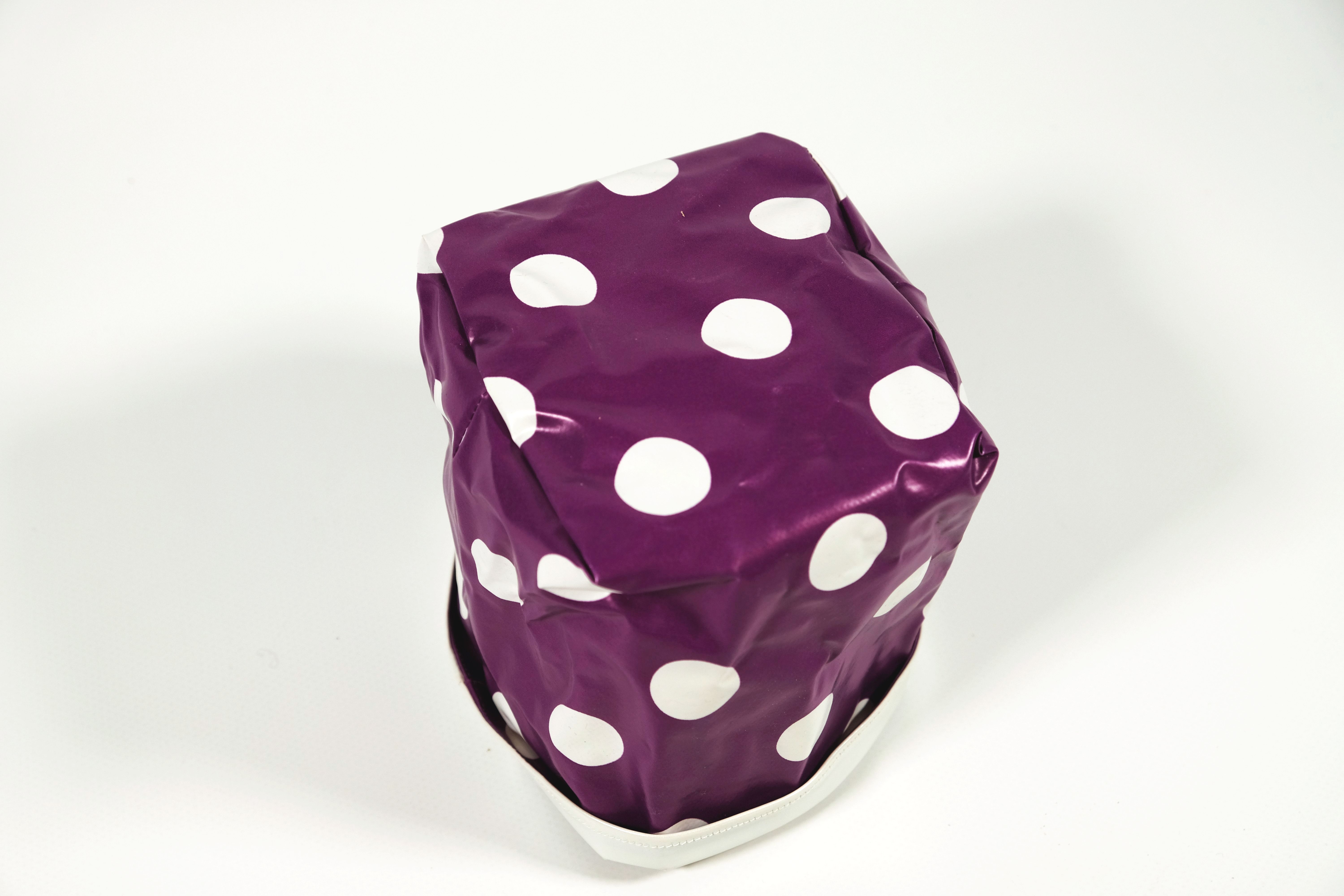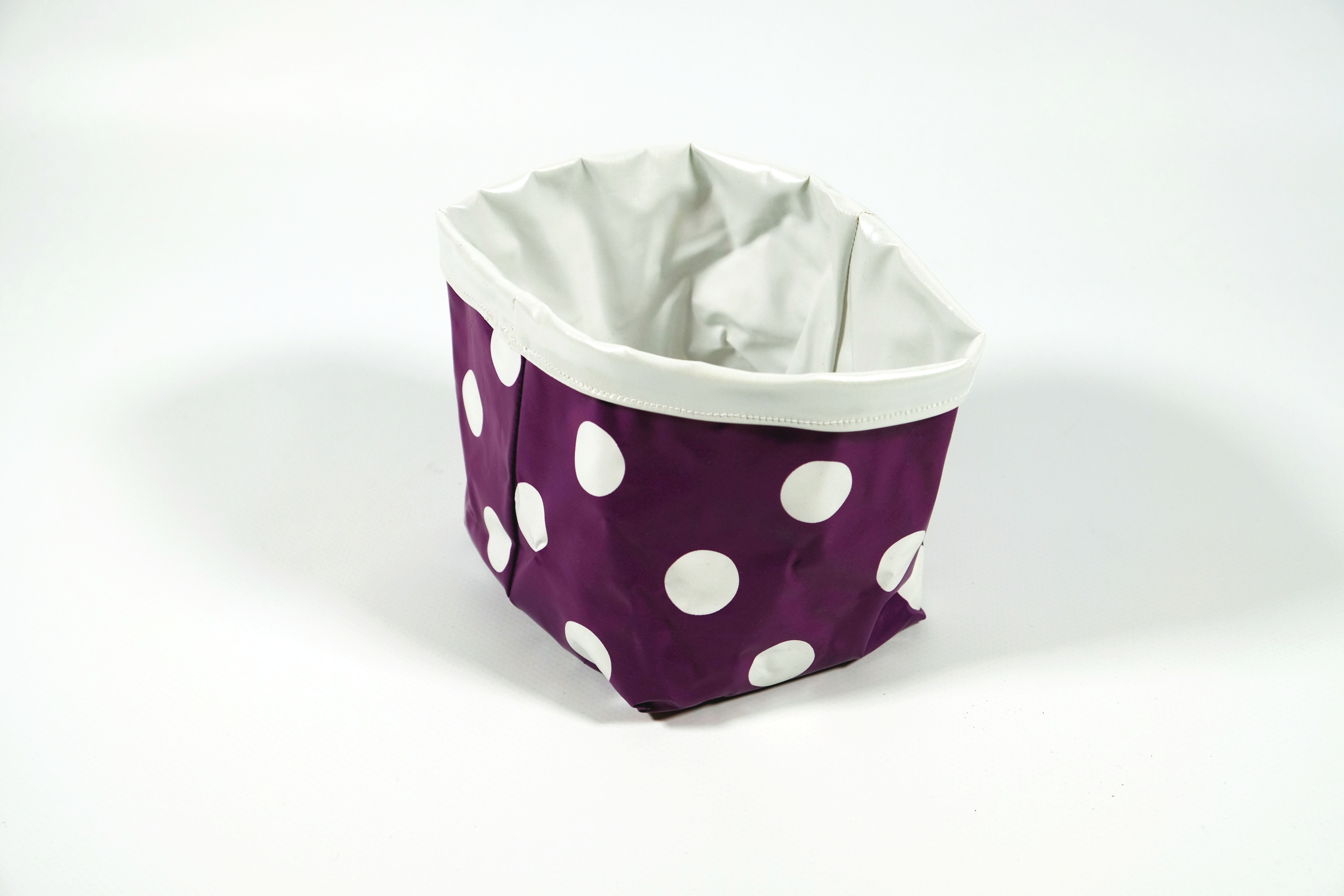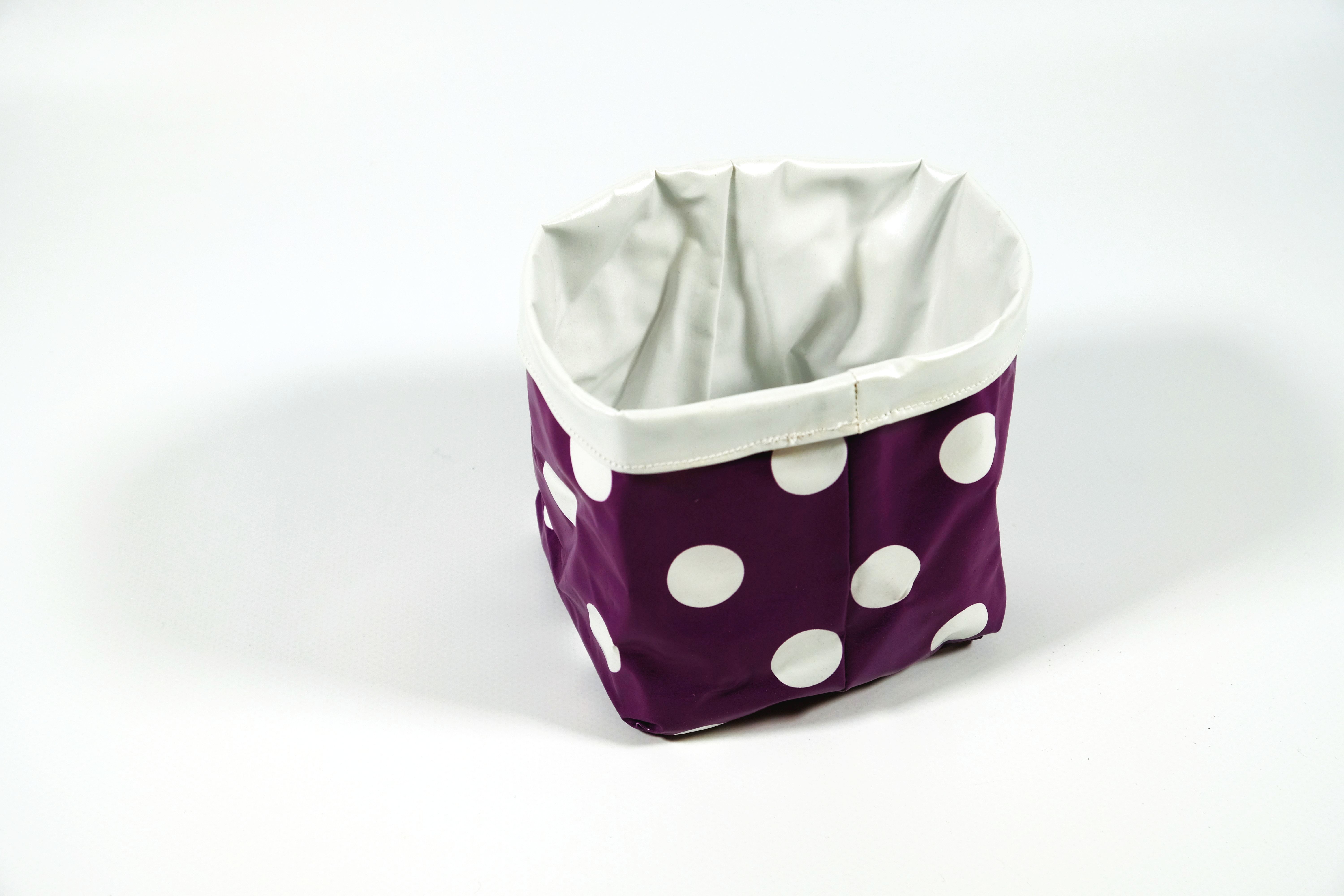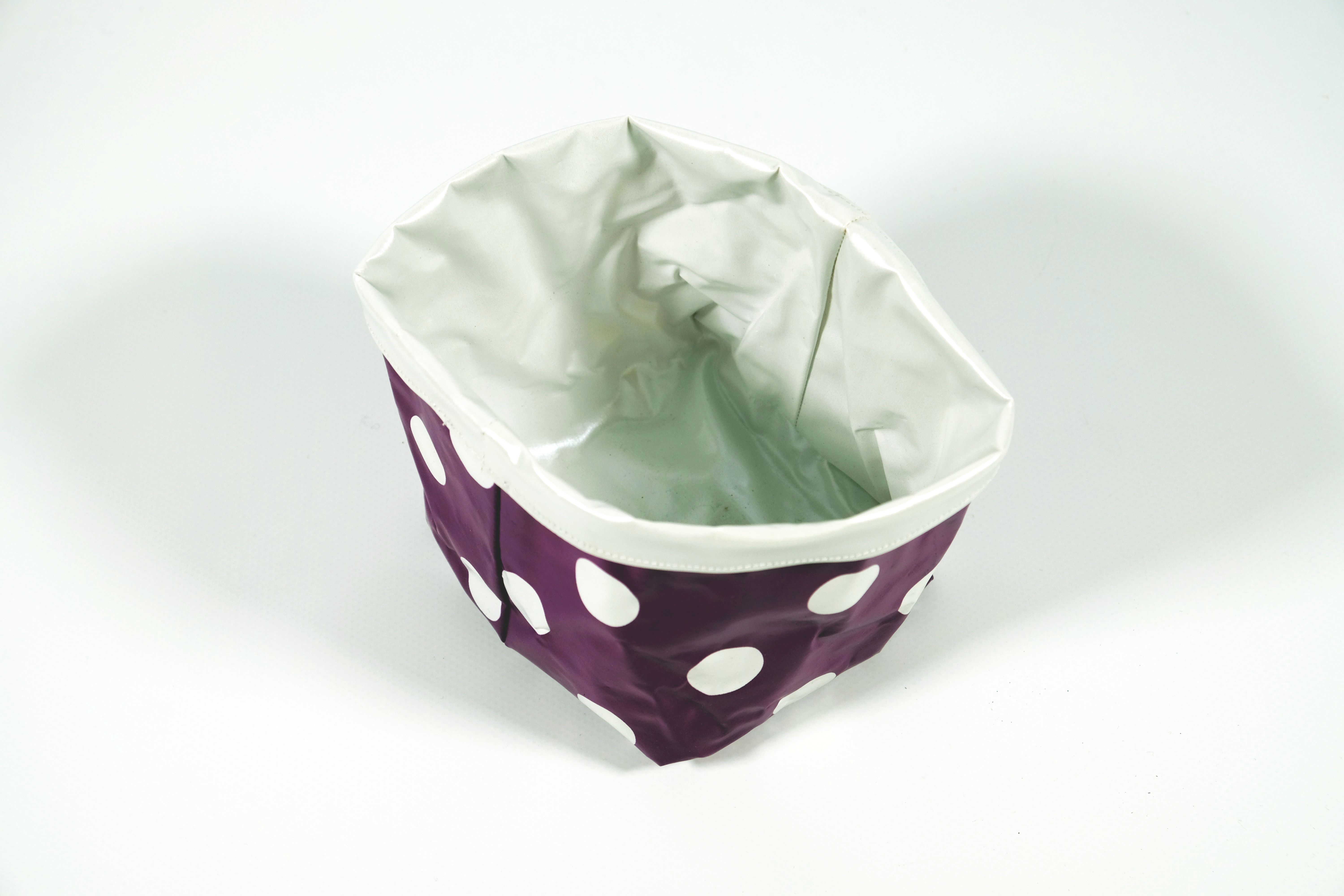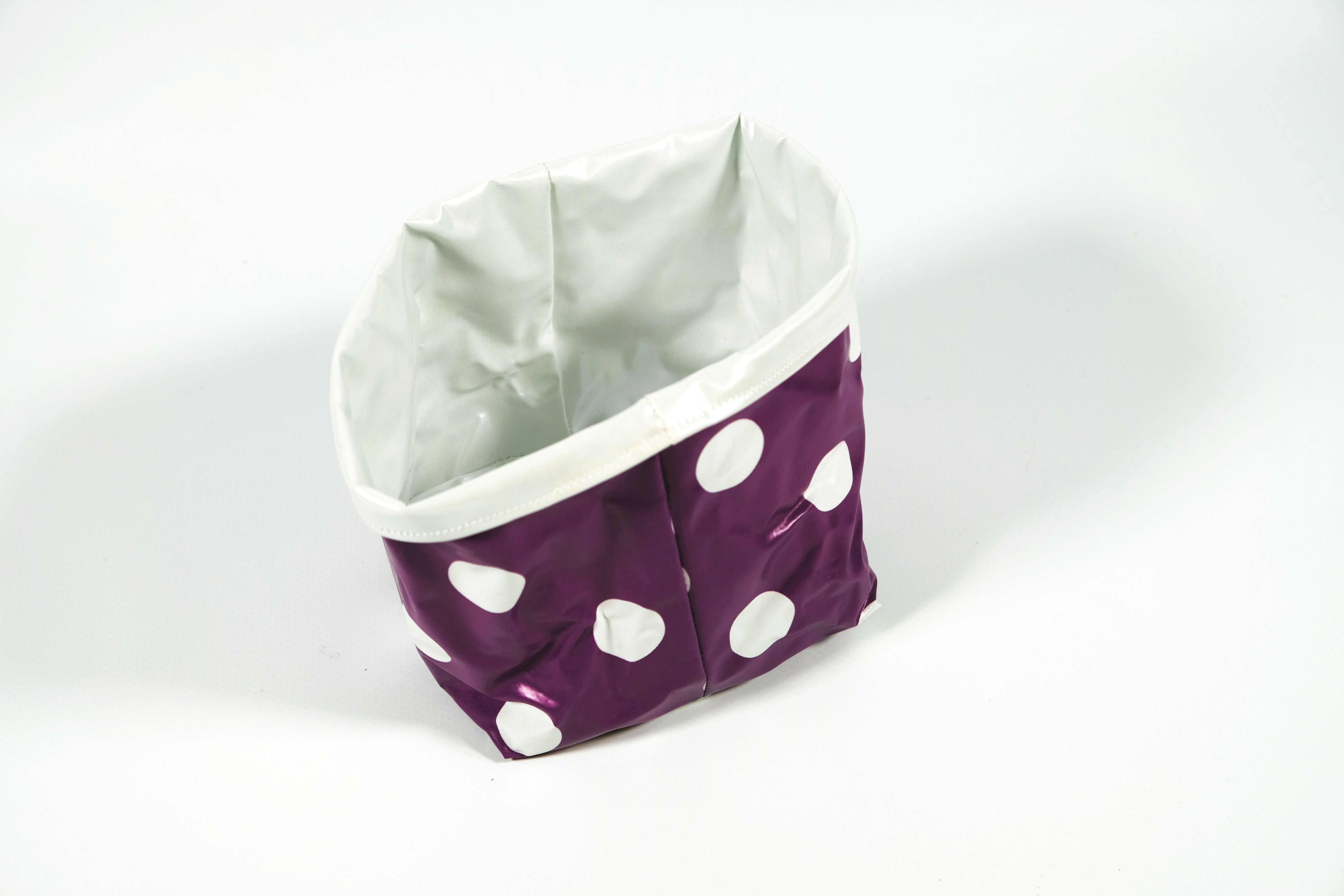 Diese Aufbewahrungsbox Namens «Cube» wurde aus einem Plastikwachstuch von Klienten*innen im Nähatelier der Tagesstruktur Lehenmatt gemacht. Aussen ist die Box violett mit grossen weissen Punkten und innen ist sie weiss. Es kann alles Mögliche darin aufbewahrt werden. Die Box kann nach Belieben auch auf die andere Seite gekehrt werden, so dass die weisse Farbe aussen und die violette mit weissen Punkten nach innen gerichtet ist.