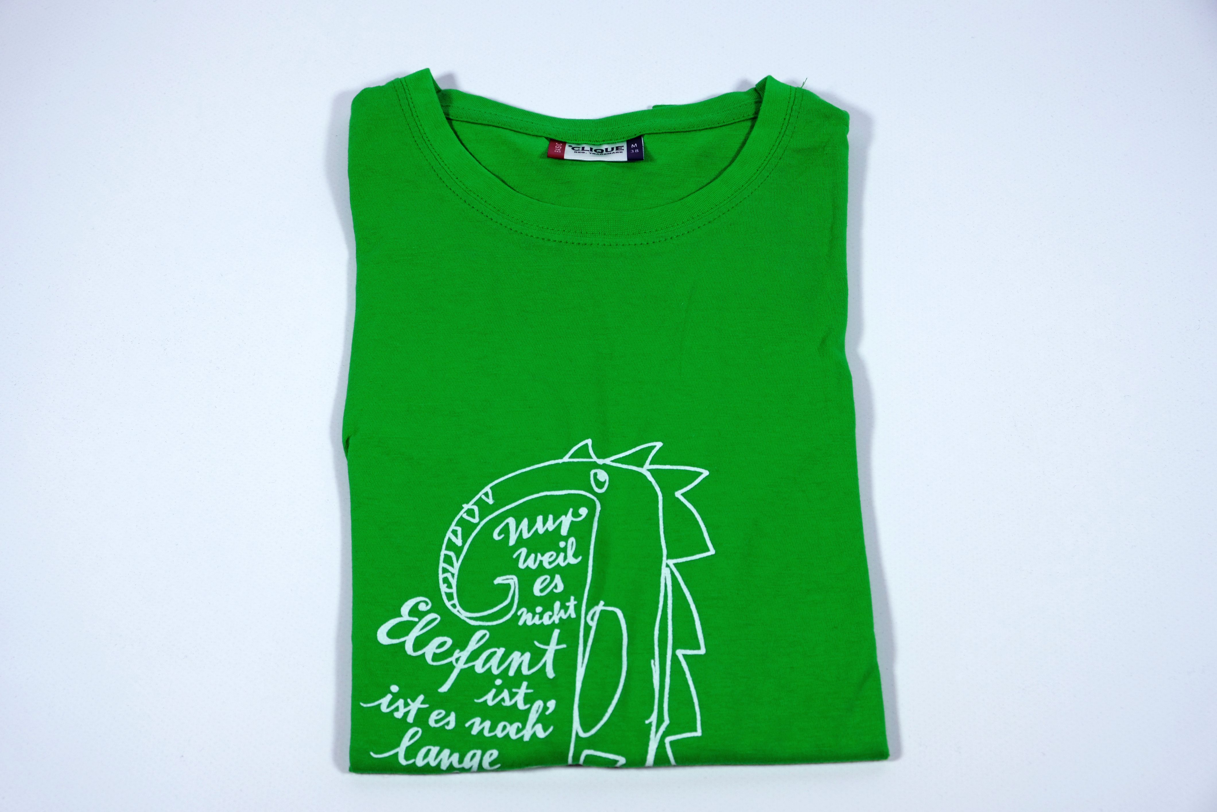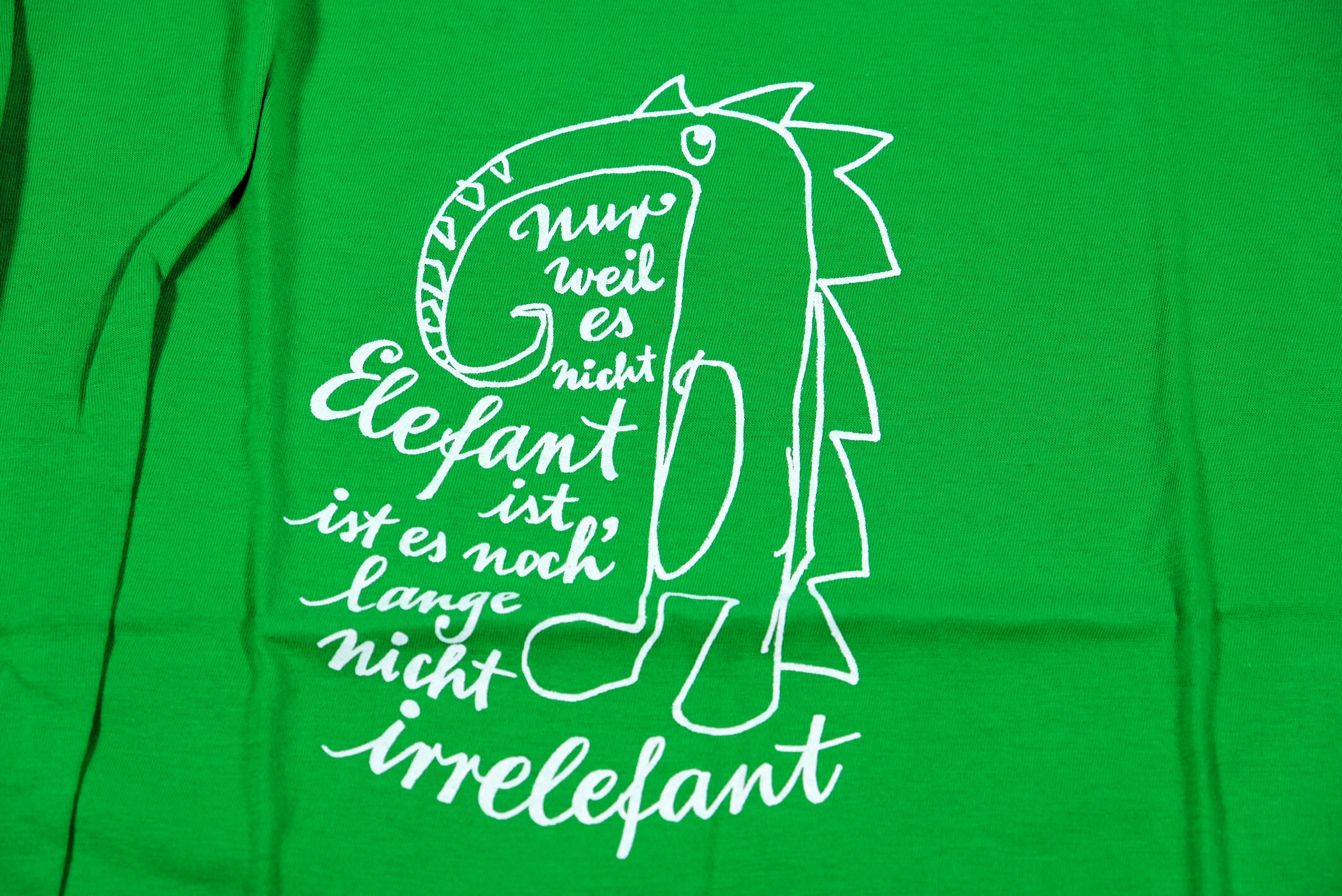 Dieses T-Shirt ist Hellgrün und hat einen weissen Fantasie-Elefanten mit einem Spruch aufgedruckt. Der Spruch lautet: "Nur weil es nicht Elefant ist, ist es noch lange nicht irrelefant".