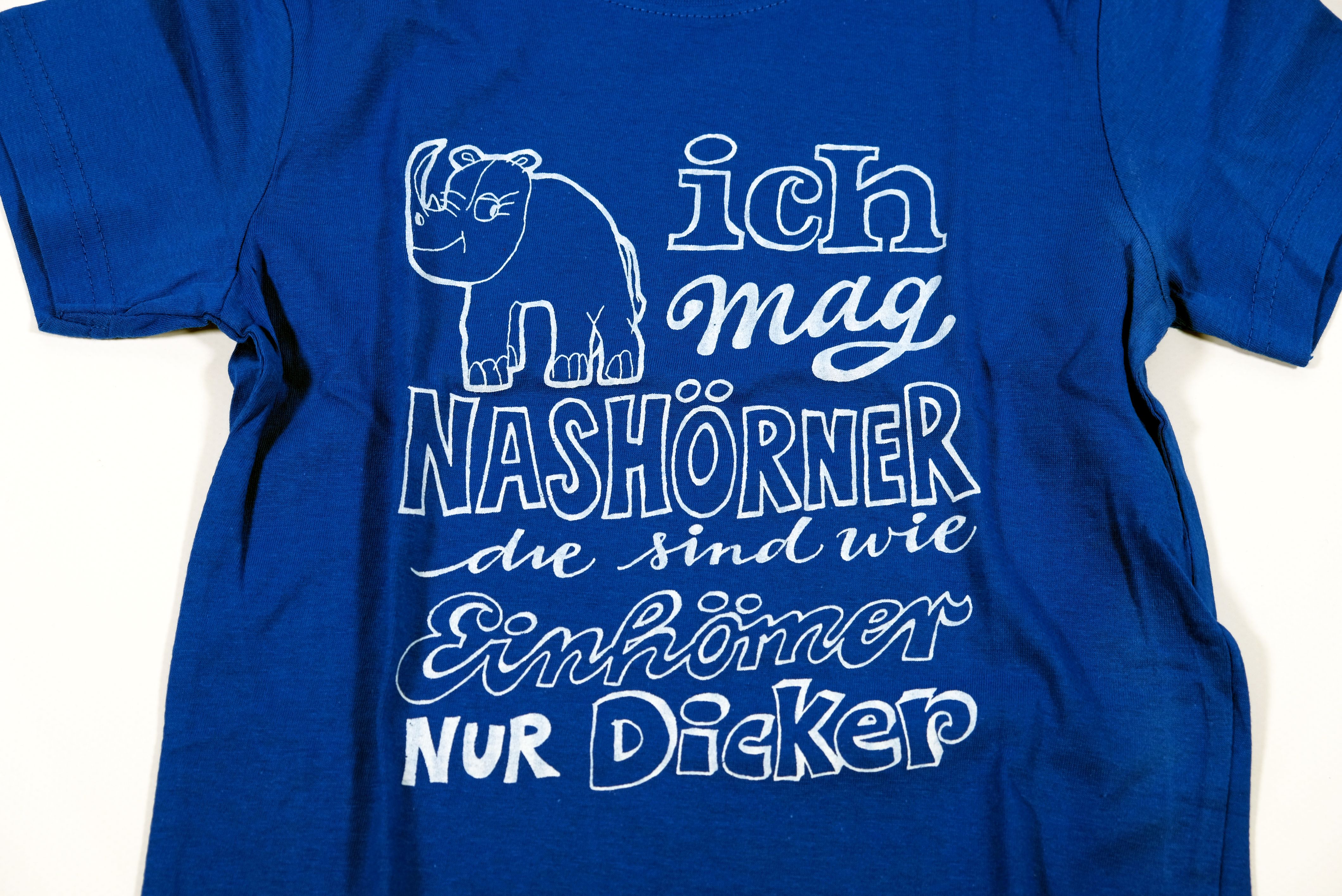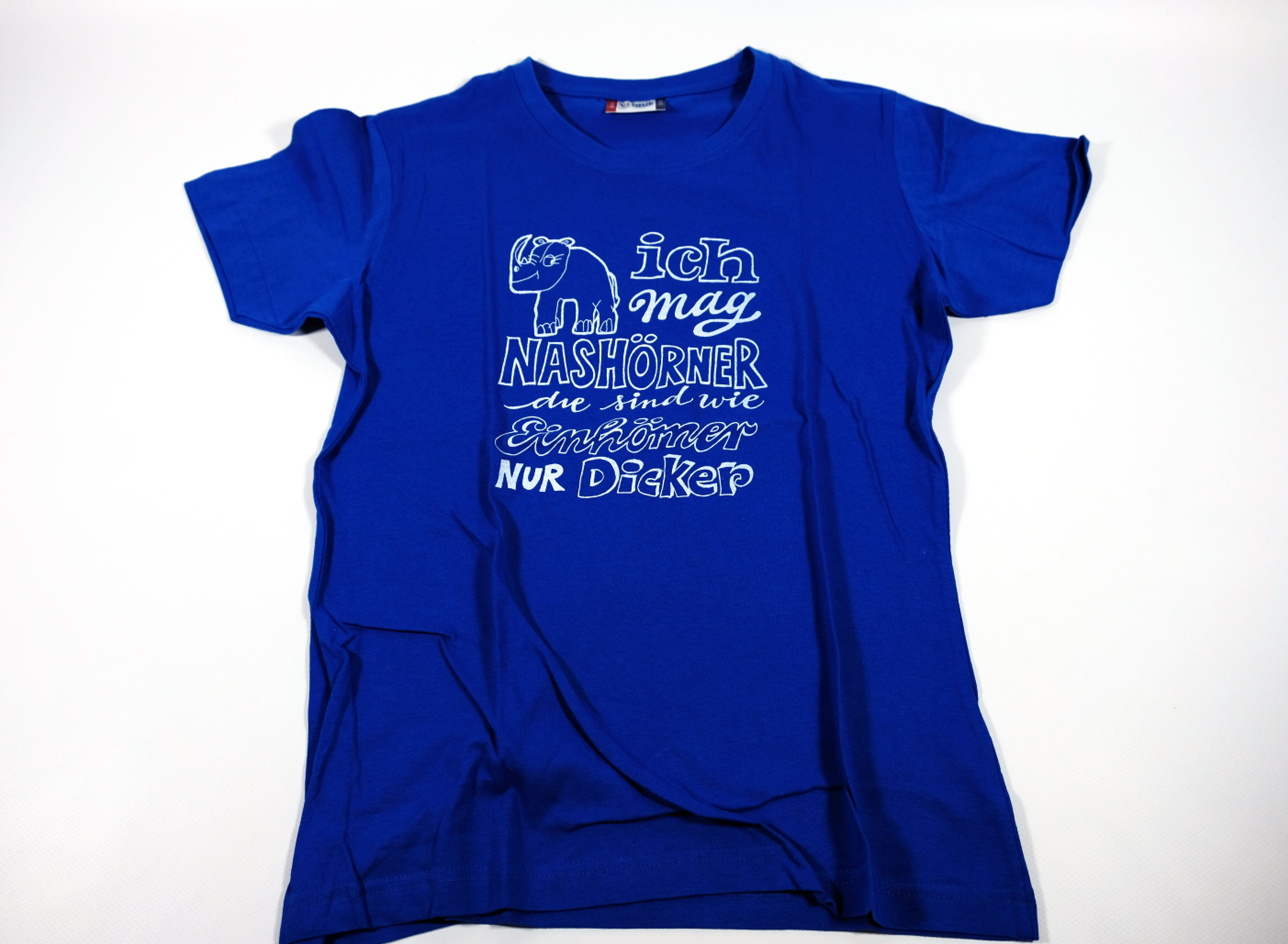 Das T-Shirt hat die Farbe Dunkelblau mit einem weissen Aufdruck. Der Aufdruck besteht aus dem Spruch "Ich mag Nashörner die sind wie Einhörner nur Dicker" und oben links ist ein fettes kleines Nashorn, dass von unseren Klienten gezeichnet wurde abgebildet. jedes Wort ist in einer anderen Schriftart gezeichnet.