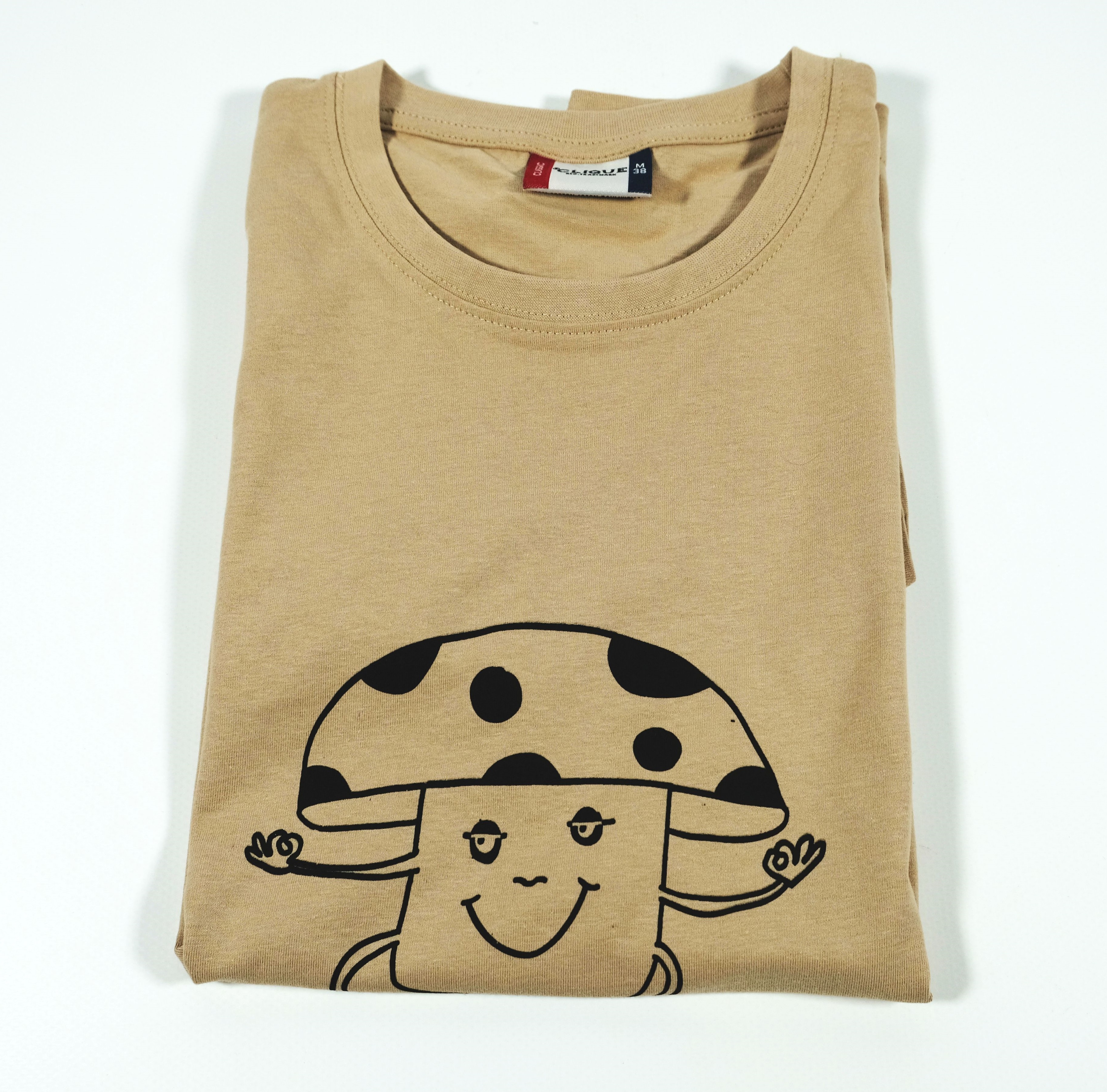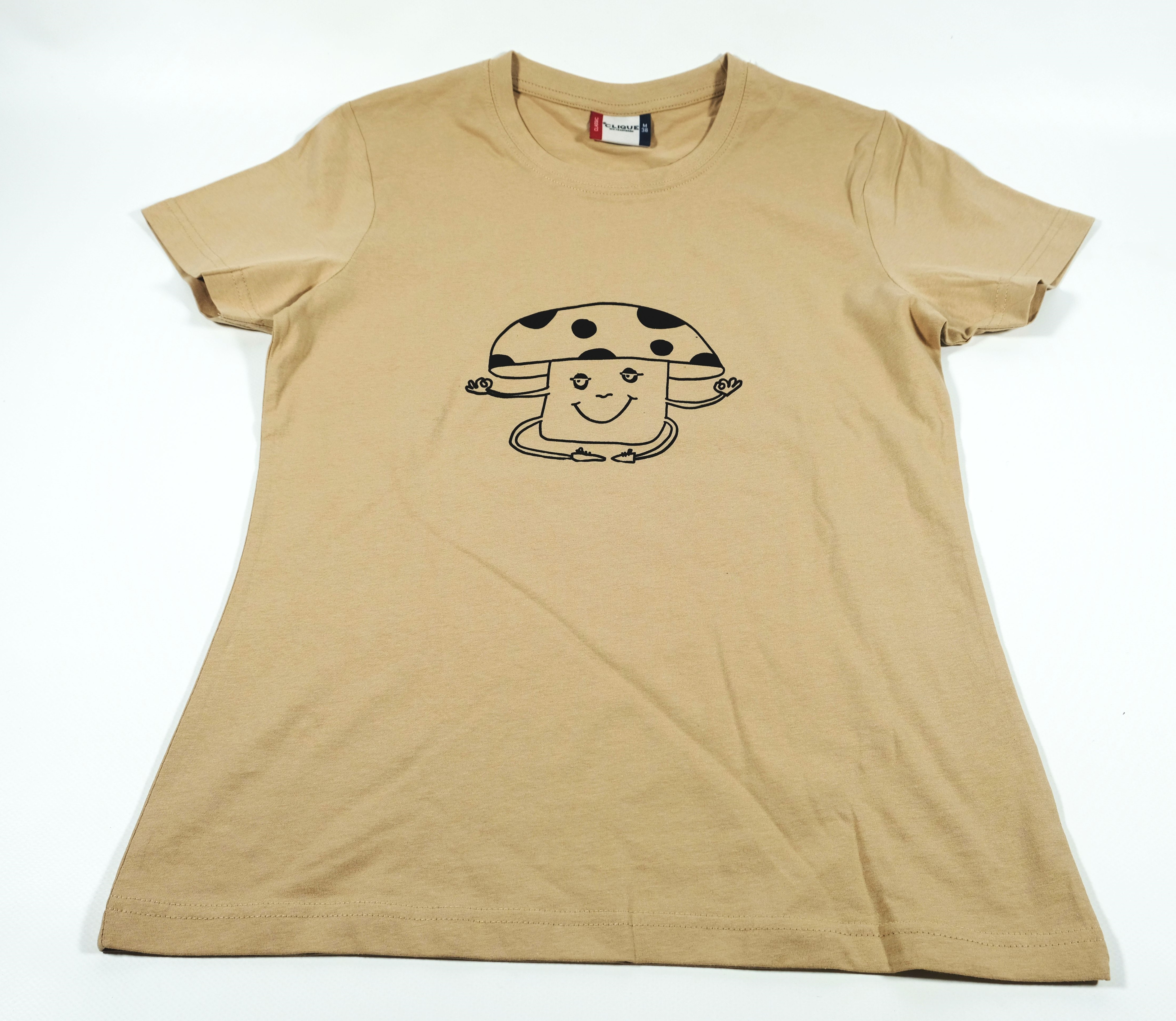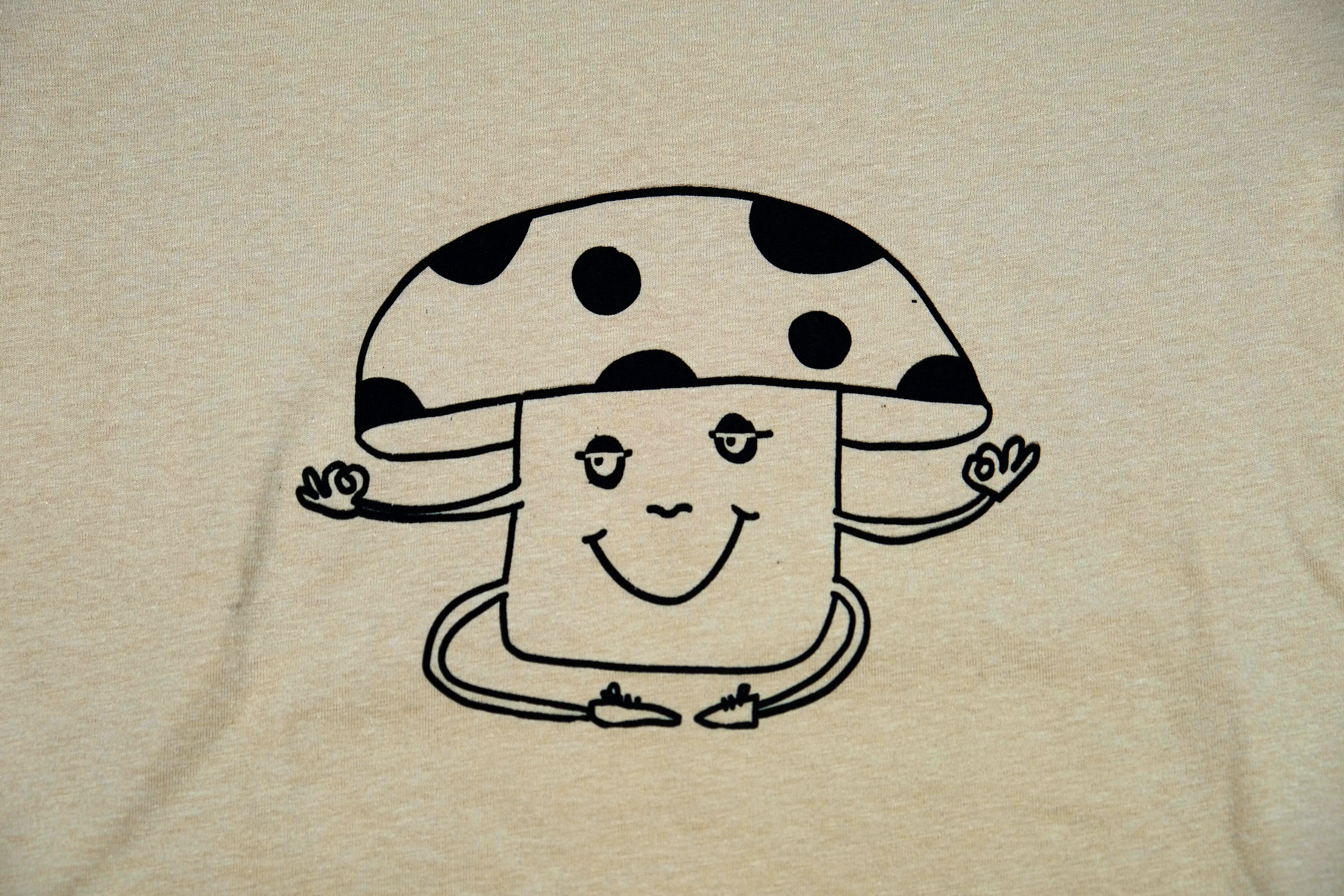 Das T-Shirt hat die Farbe Beige mit einem schwarzen Aufdruck. Der Aufdruck besteht aus einem Fliegenpilz, der eine Yogasitzhaltung eingenommen hat. Die Zeichnung wurde von unseren Klient*innen entworfen.