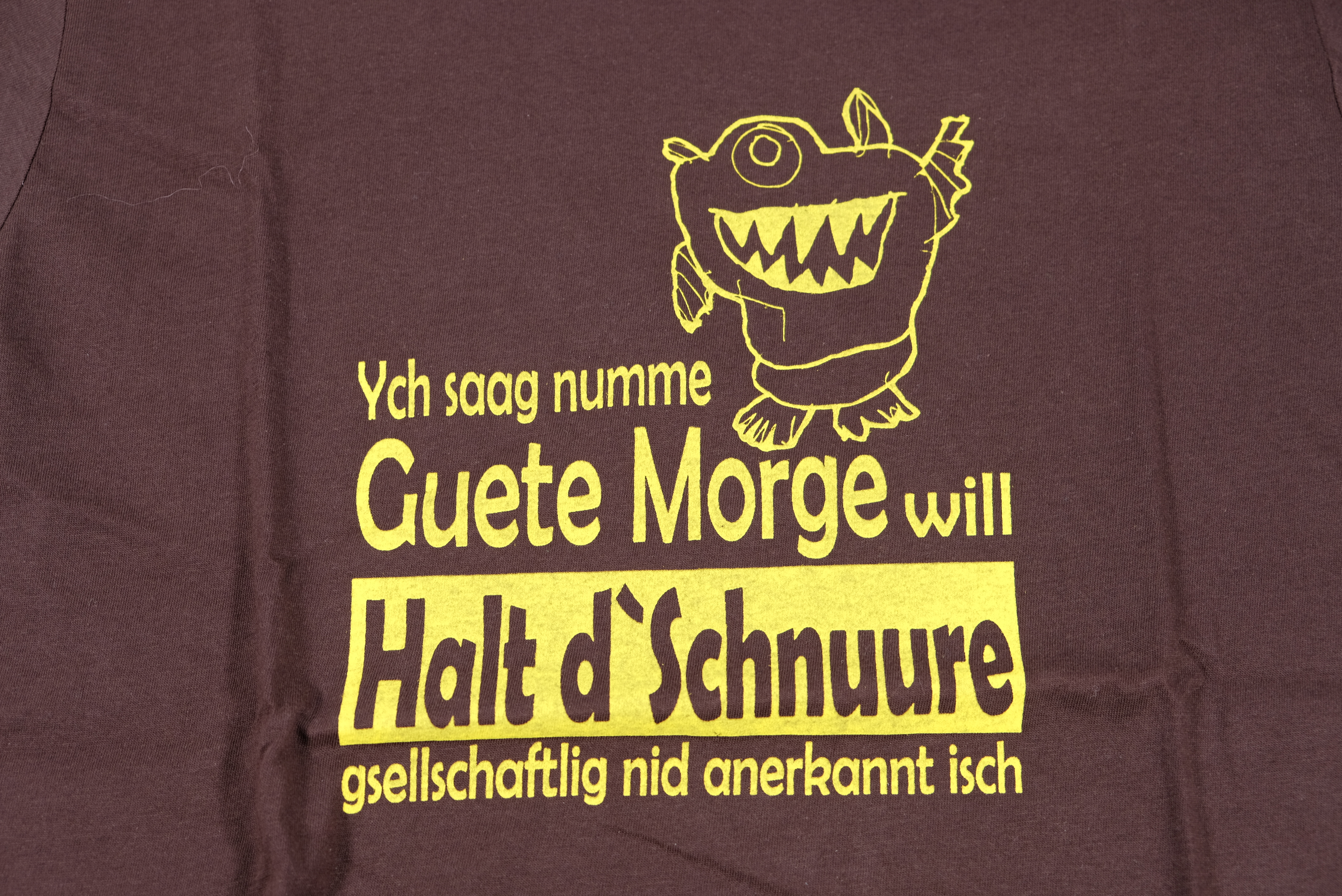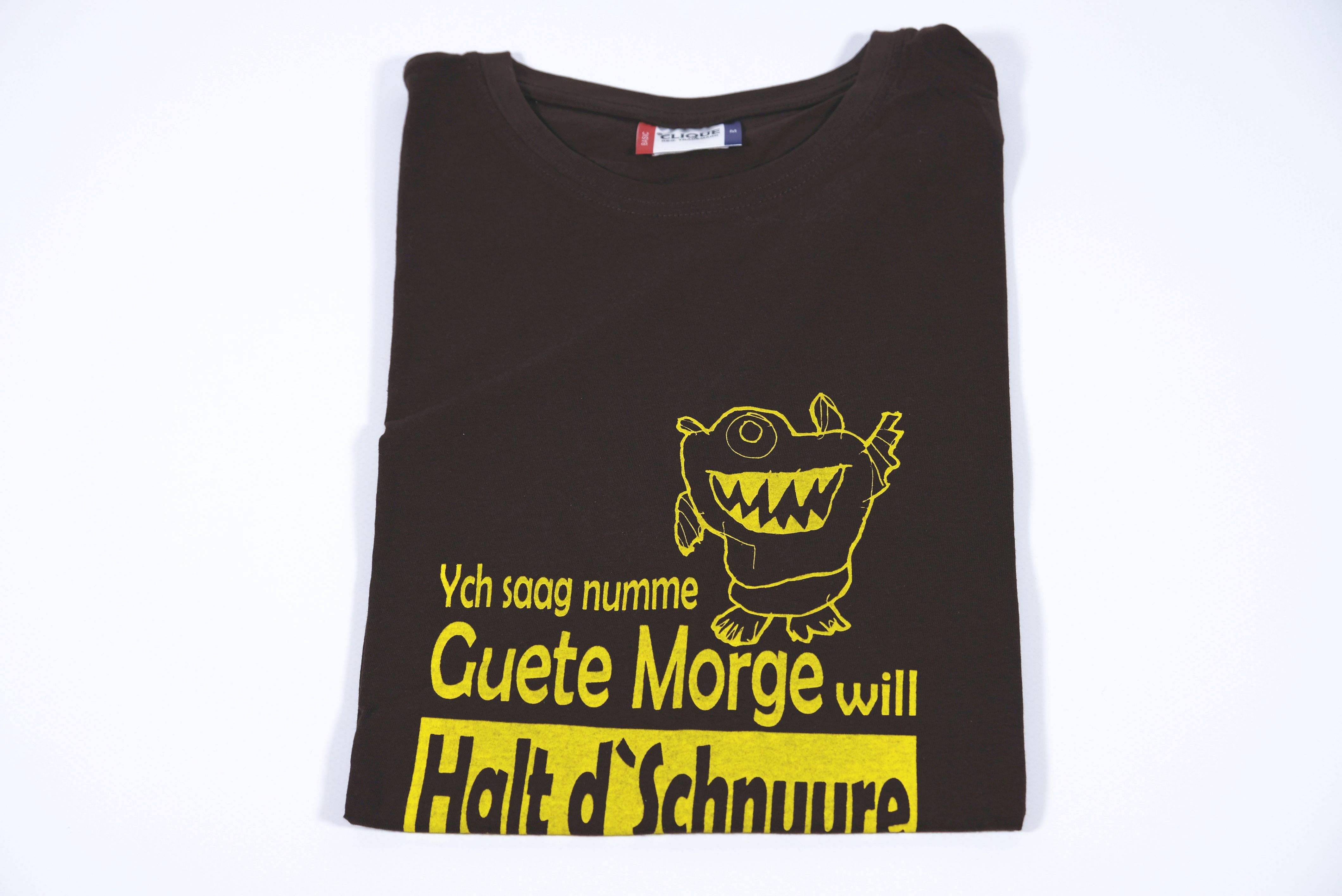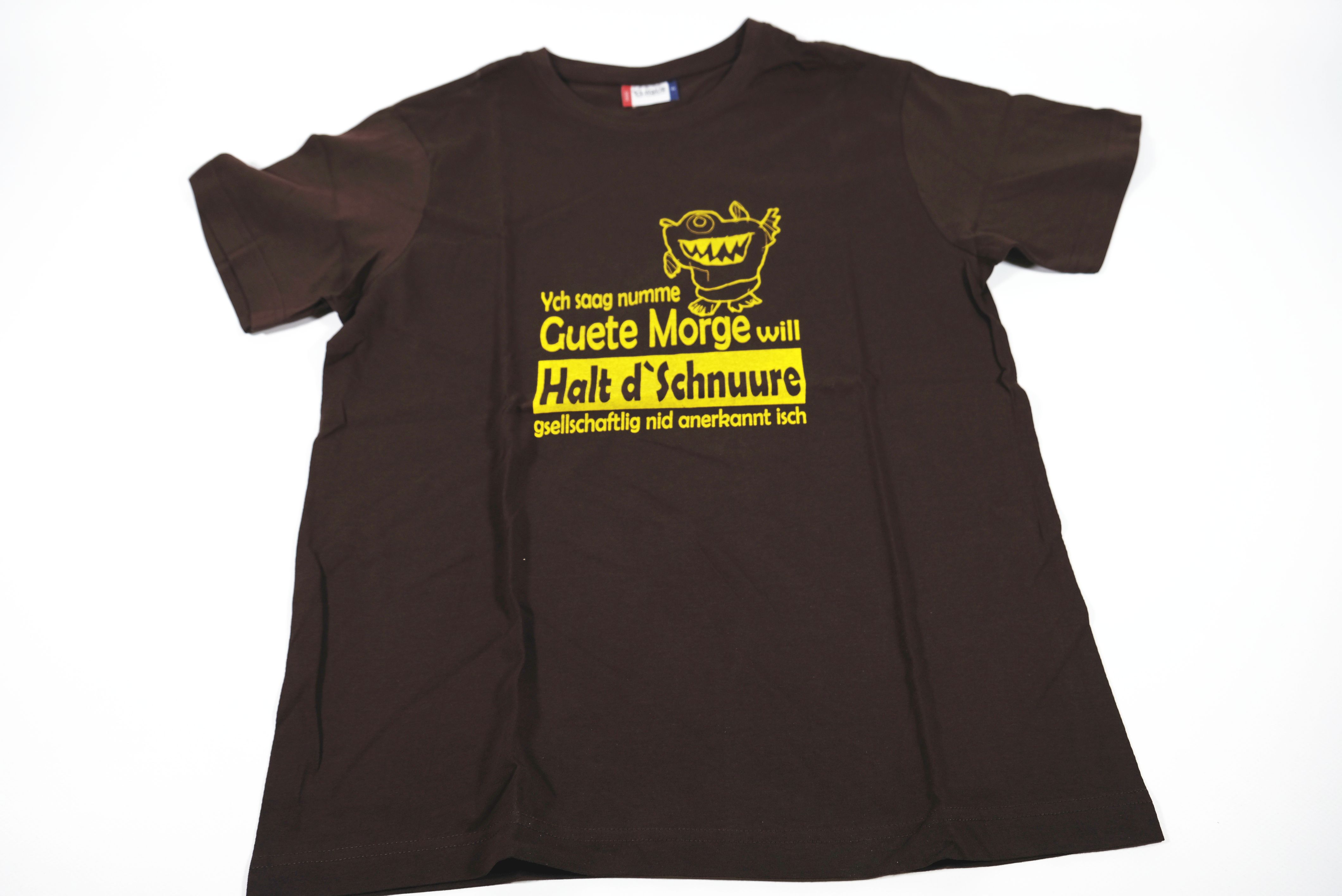 Das T-Shirt hat die Farbe Braun mit einem gelben Audruck. Der Aufdruck besteht aus dem Spruch "Ich saag numme Guete Morge will Halt d`Schnuure gsellschaftlig nid anerkannt isch" und oben rechts ist ein Monster, dass von unseren Klienten gezeichnet wurde.