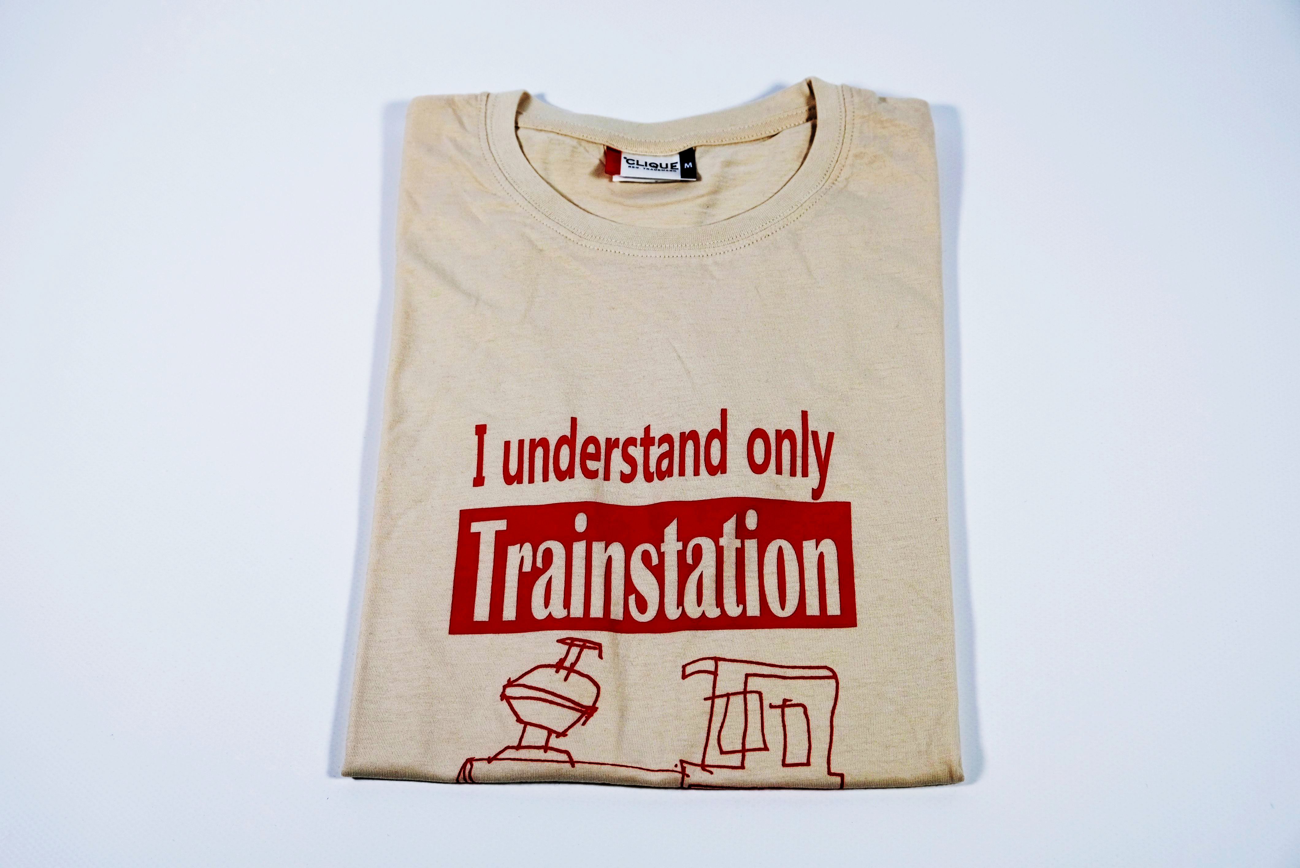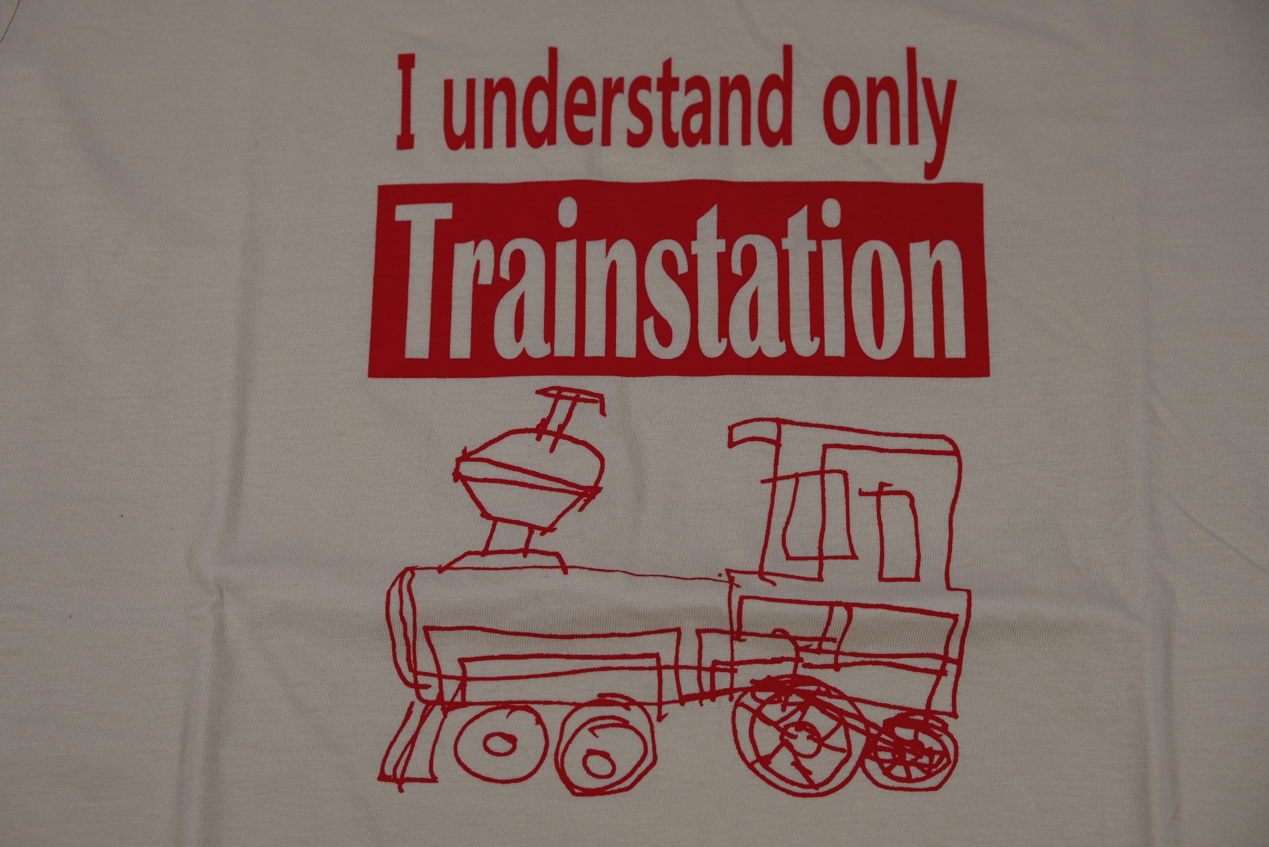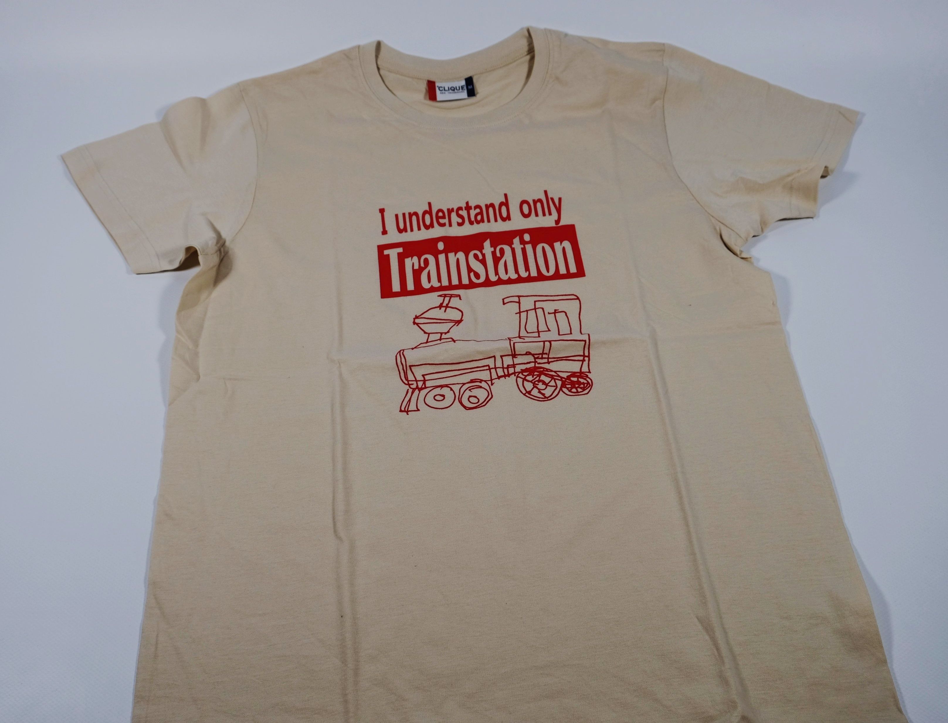 Das T-Shirt hat die Farbe Beige mit einem roten Aufdruck. Der Aufdruck besteht aus einer gezeichneten Lokomotive über dem der Spruch "I understand only Trainstation" abgebildet ist.